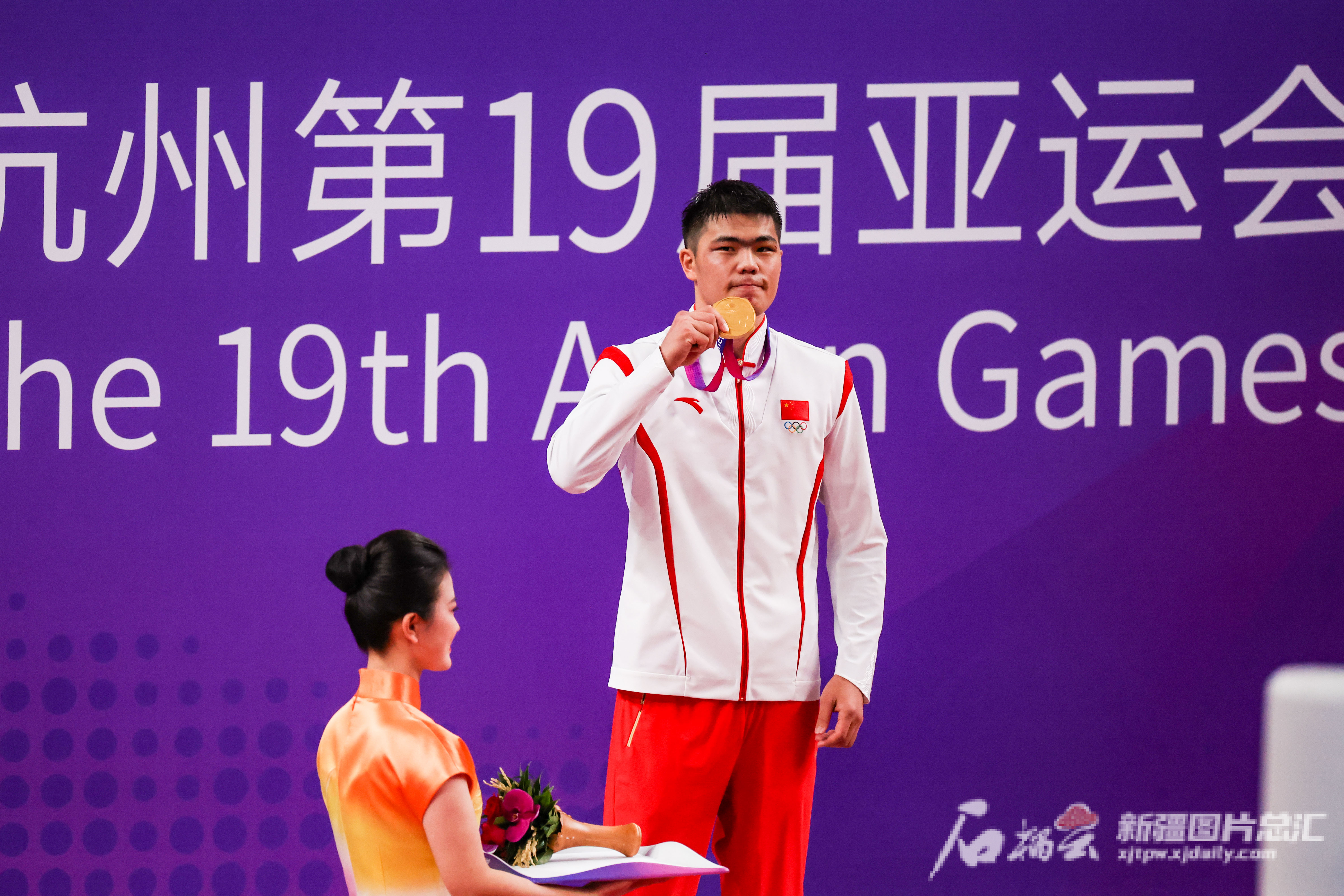 10月5日,中国选手托合塔尔别克·唐拉提汗在领奖台上展示金牌。