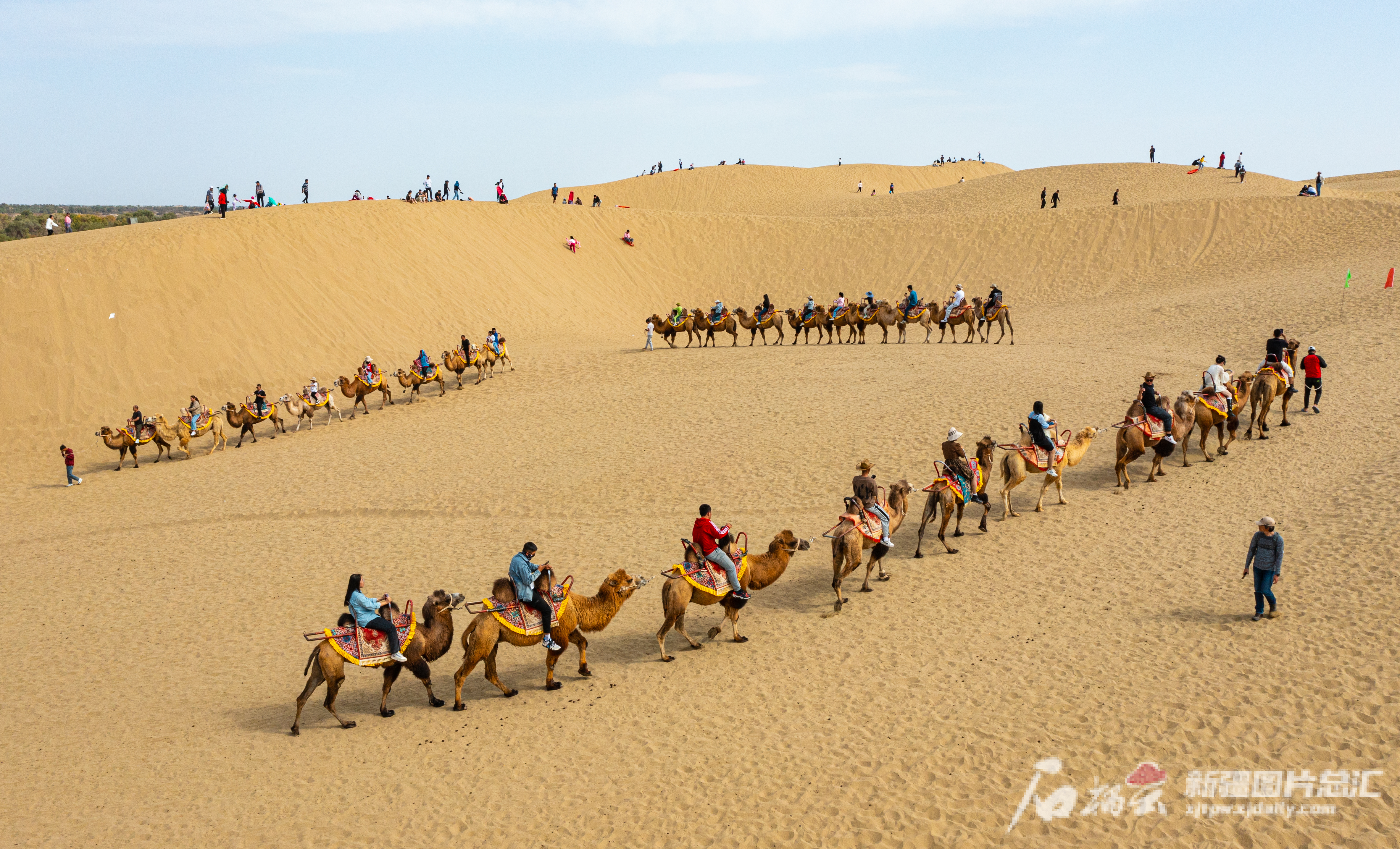10月5日,游客在尉犁县罗布人村寨景区体验骆驼骑行,感受大漠风光。汪志鹏 摄