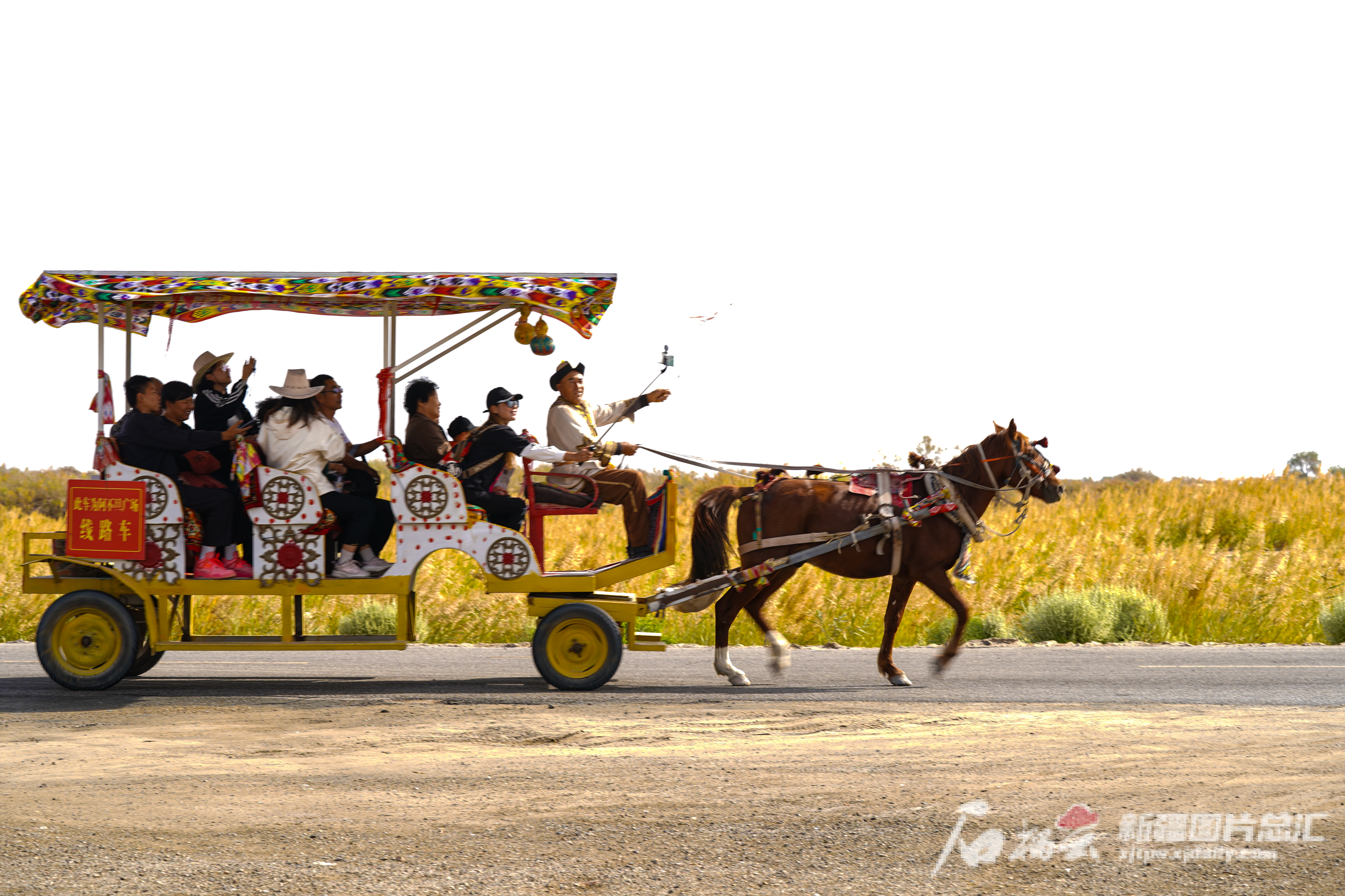 10月5日,游客在尉犁县罗布人村寨景区乘坐马车游玩。汪志鹏 摄