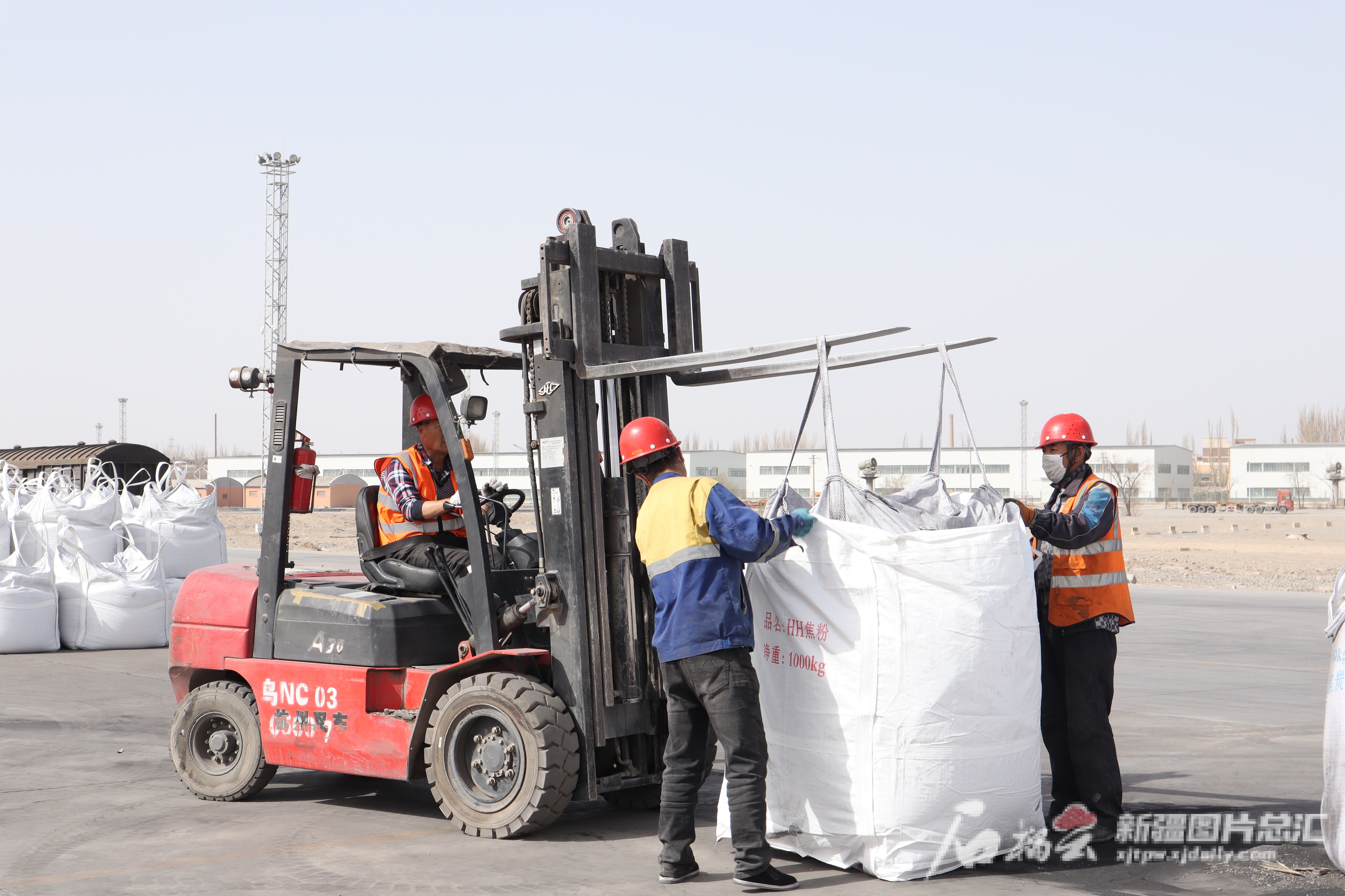 4月3日,哈密货运中心装卸人员用叉车将吨袋包装的焦炭挑起准备装车。张洁摄