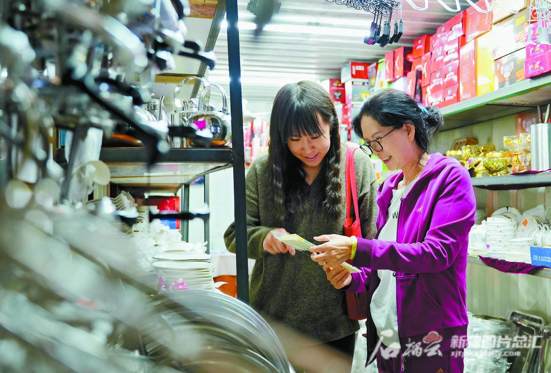9月21日,在吉尔吉斯斯坦比什凯克市最大中国商品市场——中海市场,新疆商人苏风英(右)为消费者介绍新到的中国商品。石榴云/新疆日报记者 阿尔曼·热扎克摄