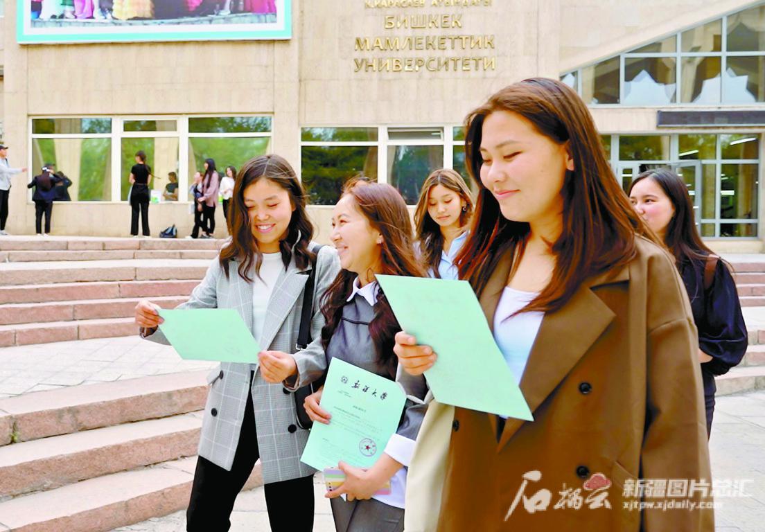 9月19日,吉尔吉斯斯坦比什凯克国立大学孔子学院,拿到新疆大学进修中文录取通知书的学生开心不已。石榴云/新疆日报记者 阿尔曼·热扎克摄