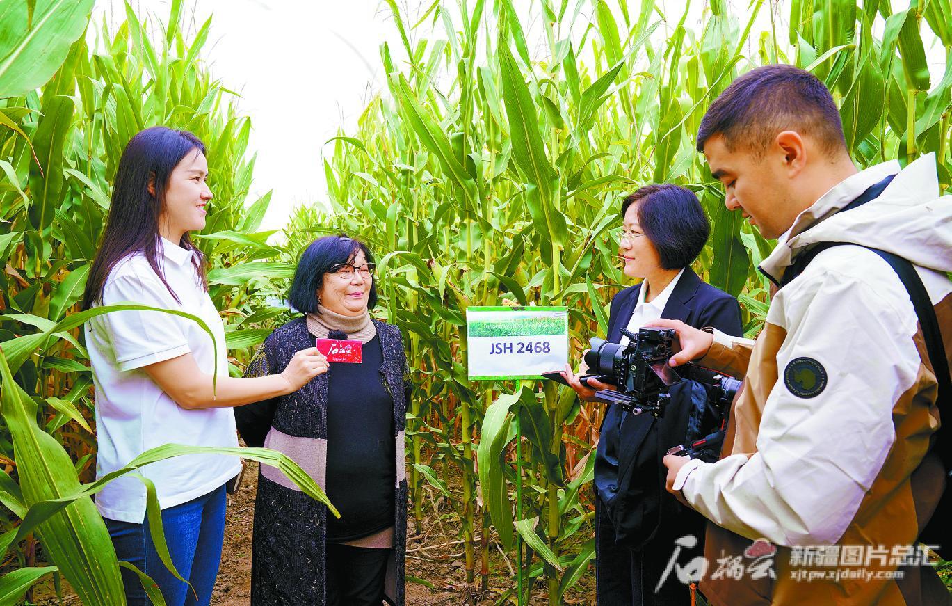9月14日,报道团队记者在位于哈萨克斯坦阿拉木图市的九圣禾种业农作物展示示范基地,向哈萨克斯坦国家种植业与农作物生产研究所豆科作物和玉米实验室首席研究员欧玛诺娃·阿依曼博士(左二)了解九圣禾2468玉米种子在这里的生长情况。石榴云/新疆日报记者 王琦铭摄