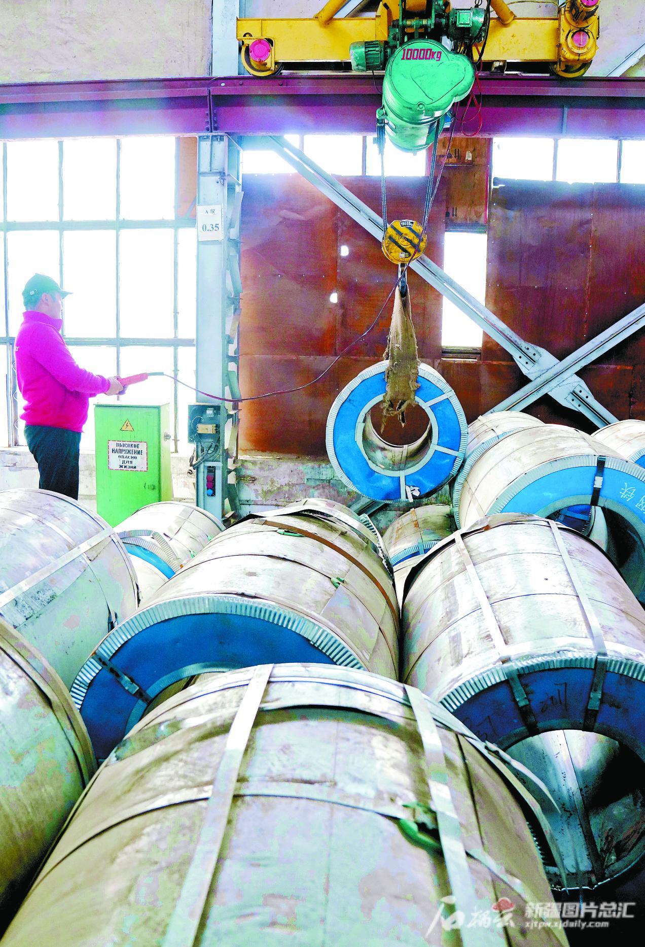 9月13日,位于哈萨克斯坦阿拉木图市的哈萨克钢铁集团库房,工作人员将钢材吊装入库。该集团销售的镀锌钢卷等货物中,40%来自宝钢集团新疆八一钢铁有限公司。石榴云/新疆日报记者 王琦铭摄