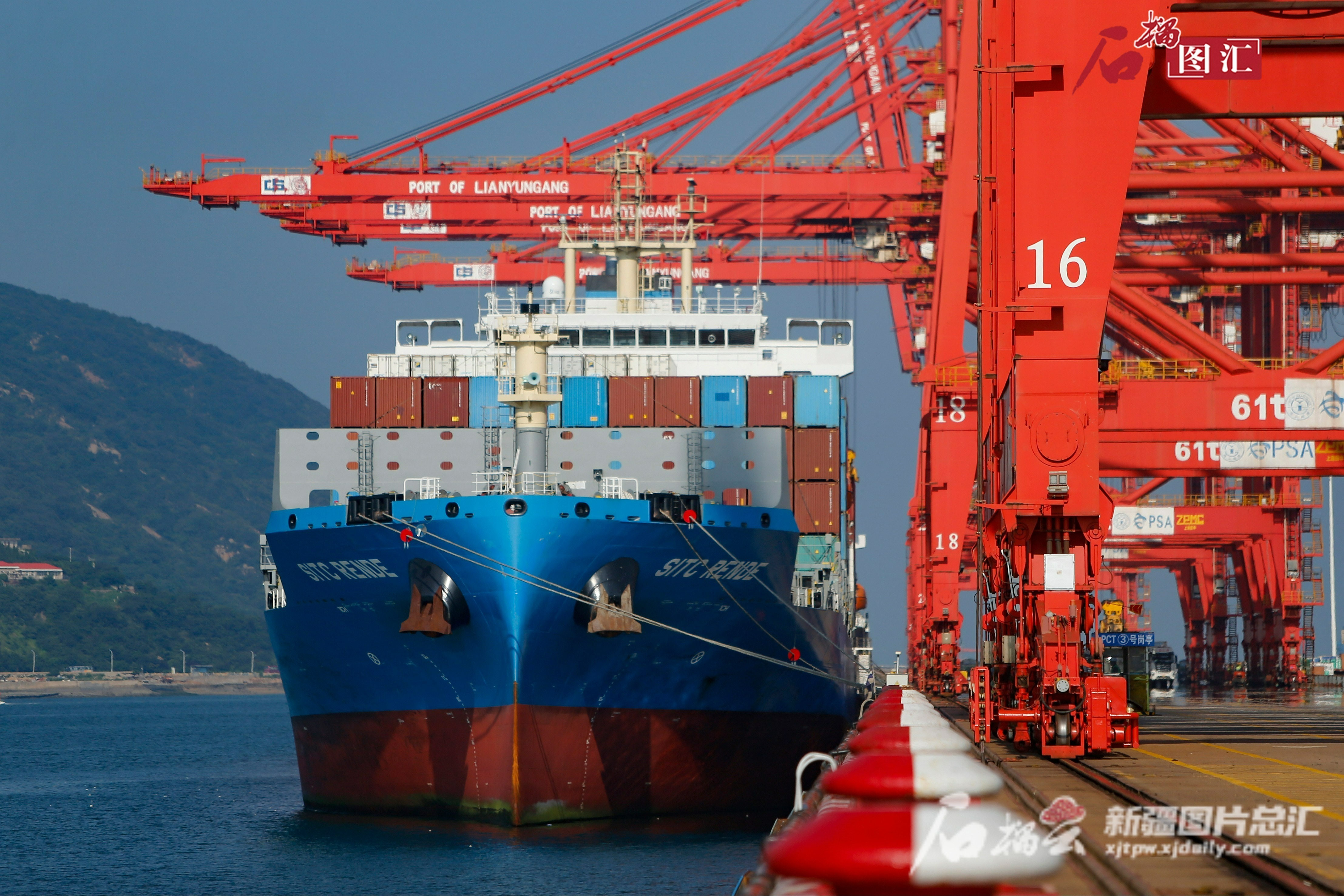 8月8日,一艘集装箱货轮在连云港港区码头准备启航。石榴云/新疆日报记者 谢龙摄