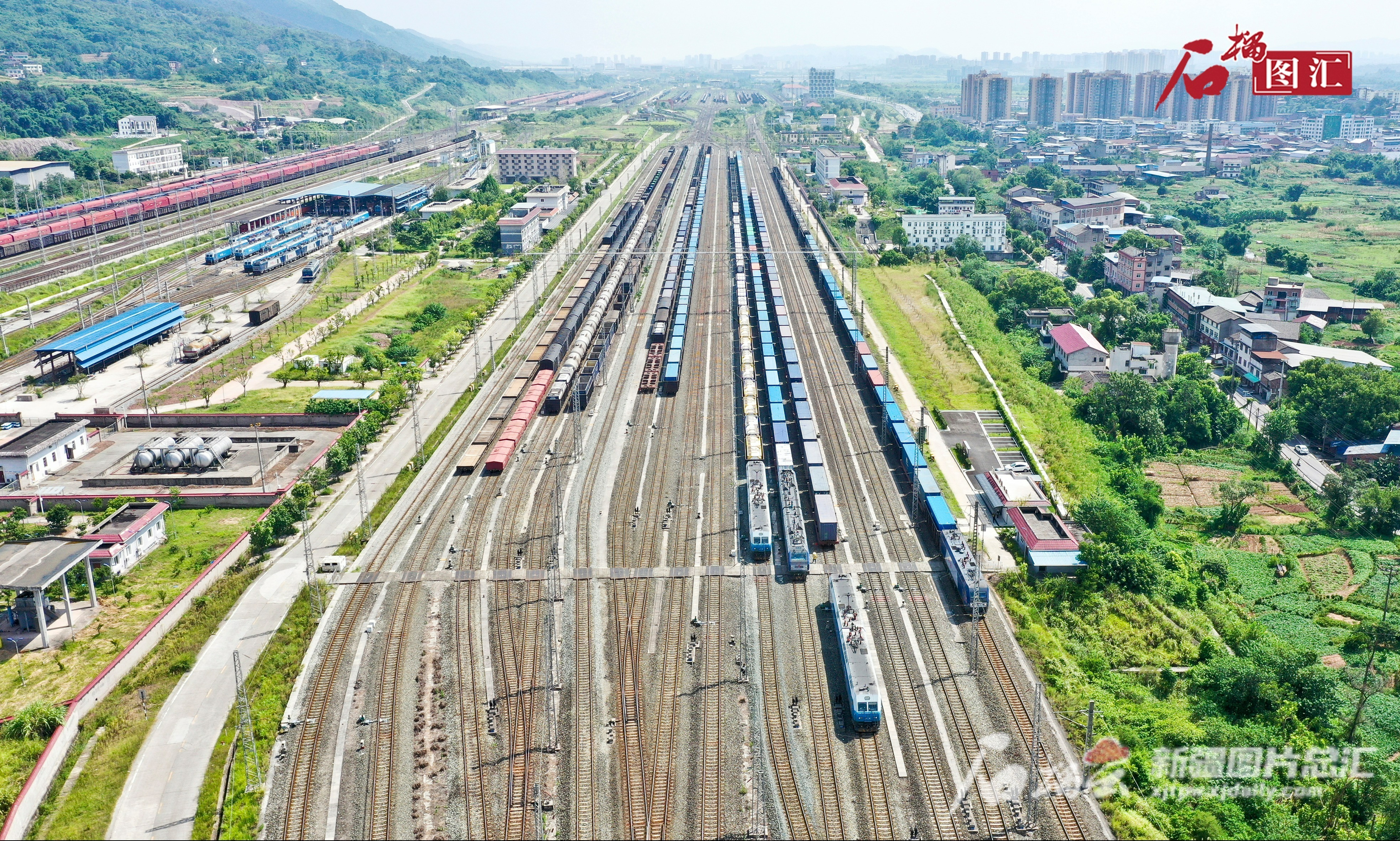 8月11日,位于重庆市沙坪坝区的重庆兴隆场编组站,准备出发的中欧班列(无人机摄)。石榴云/新疆日报记者 汤永摄