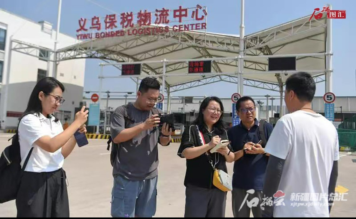 8月17日,新疆日报社(集团)“奔腾之路——‘一带一路’沿线大型全媒体报道”小分队记者在义乌保税物流中心采访。石榴云/新疆日报记者 汤永摄