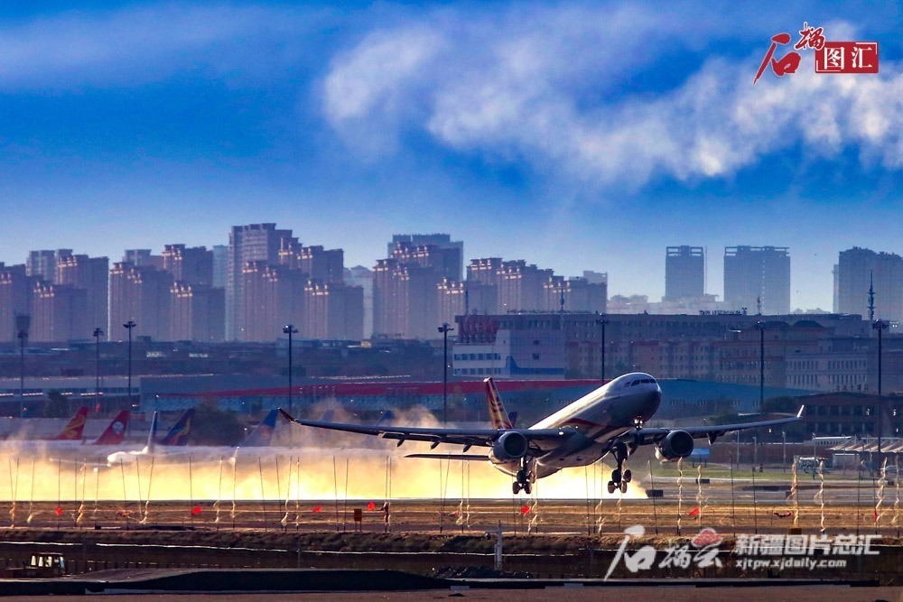 8月13日,乌鲁木齐地窝堡国际机场,一架客机伴着晨光腾空而起,开启新的征程。石榴云/新疆日报记者 蔡增乐摄
