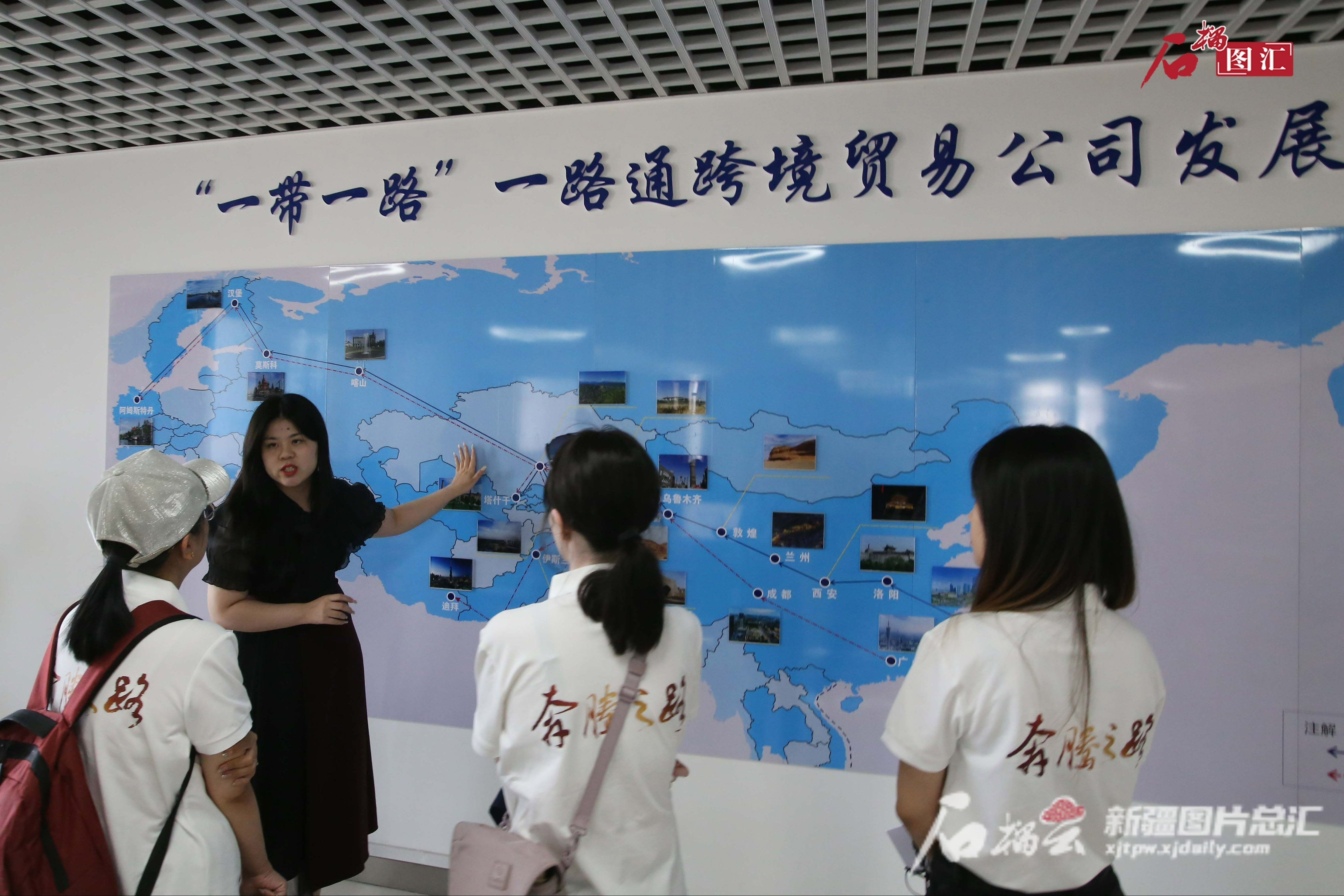 8月18日,工作人员在位于乌鲁木齐市的新疆丝路通信息科技有限公司,给“奔腾之路——‘一带一路’沿线大型全媒体报道”小分队记者介绍一路通跨境贸易业务发展情况。石榴云/新疆日报记者 蔡增乐摄