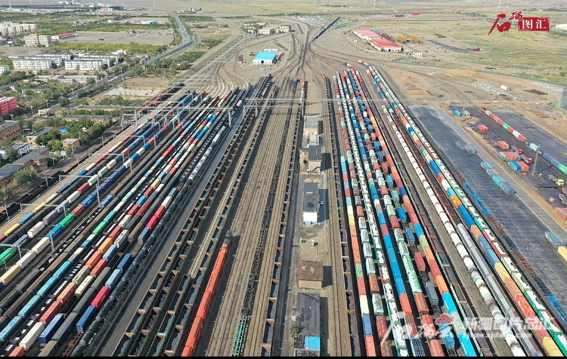 阿拉山口站编组场内停靠待发的中欧班列及其他出入境货物列车(9月1日无人机摄)。石榴云/新疆日报记者 秦梅花摄