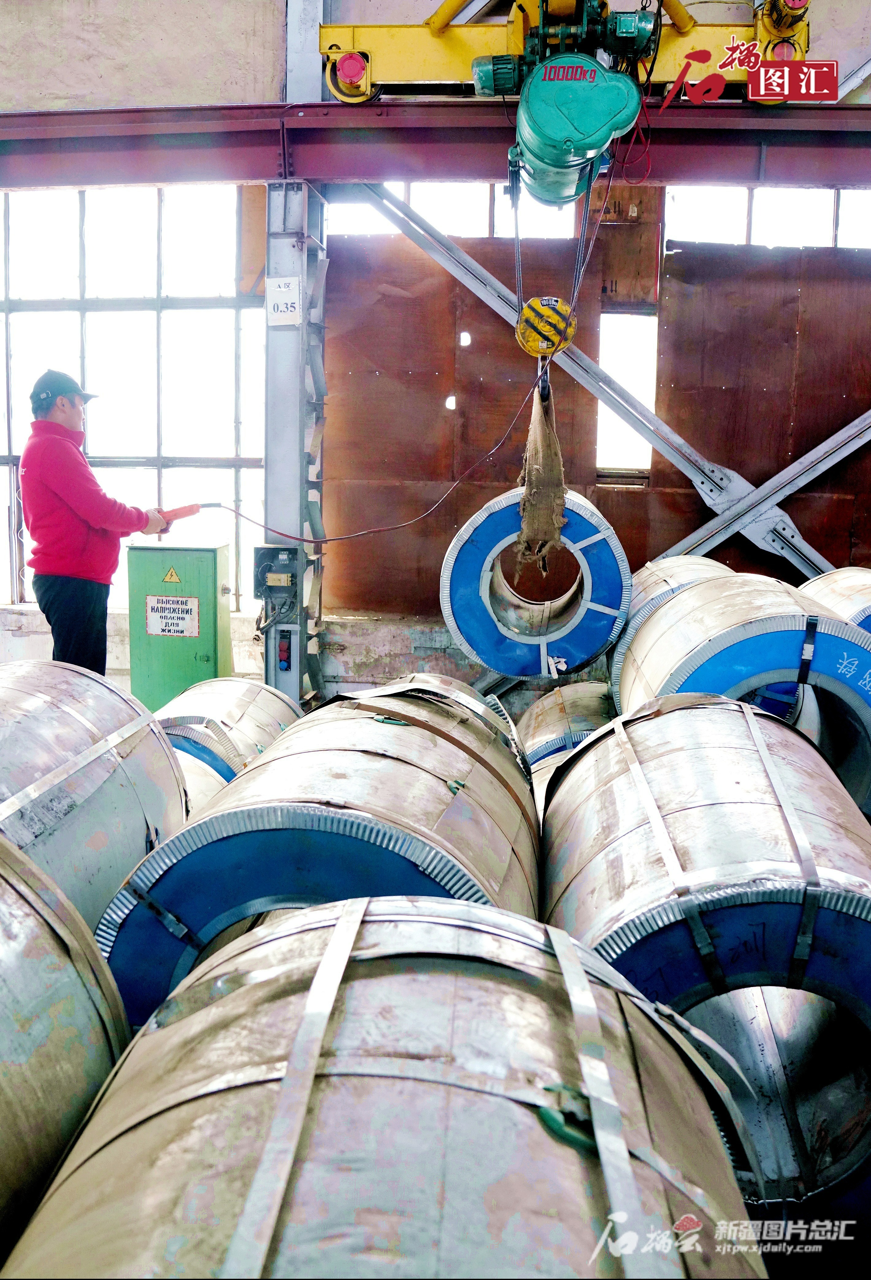 9月13日,位于哈萨克斯坦阿拉木图市的哈萨克钢铁集团库房,工作人员将钢材吊装入库。该集团销售的镀锌钢卷等货物,其中40%来自宝钢集团新疆八一钢铁有限公司。石榴云/新疆日报记者 王琦铭摄
