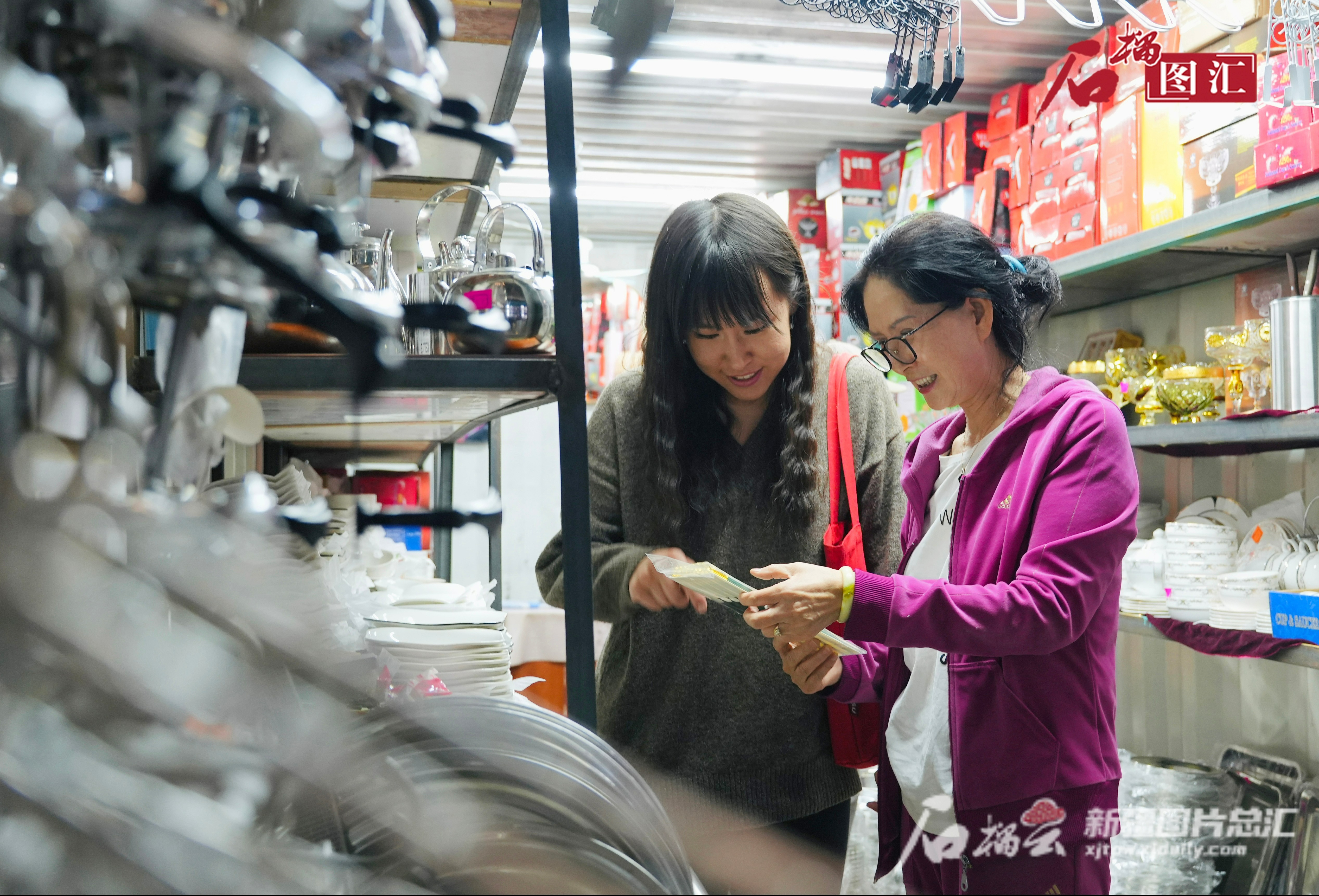 9月21日,在吉尔吉斯斯坦比什凯克市最大的中国商品市场——中海市场,新疆籍商户苏风英(右)为消费者介绍新到的中国商品。石榴云/新疆日报记者 阿尔曼·热扎克摄