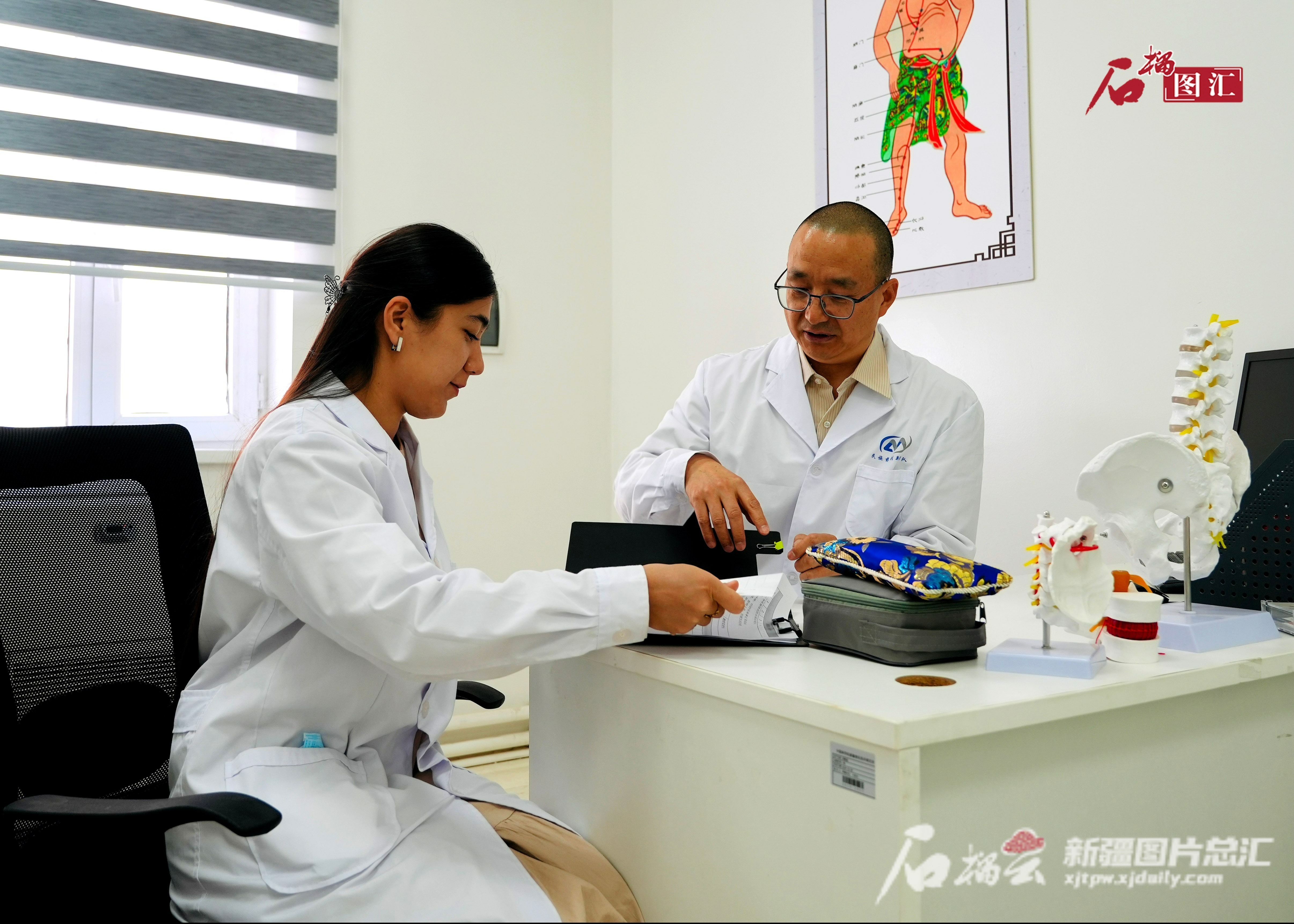 9月22日,位于乌兹别克斯坦塔什干市的中国-乌兹别克斯坦医药科技城,中国科学院新疆理化技术研究所工作人员(右)和医药科技城工作人员进行学术交流。石榴云/新疆日报记者 阿尔曼·热扎克摄