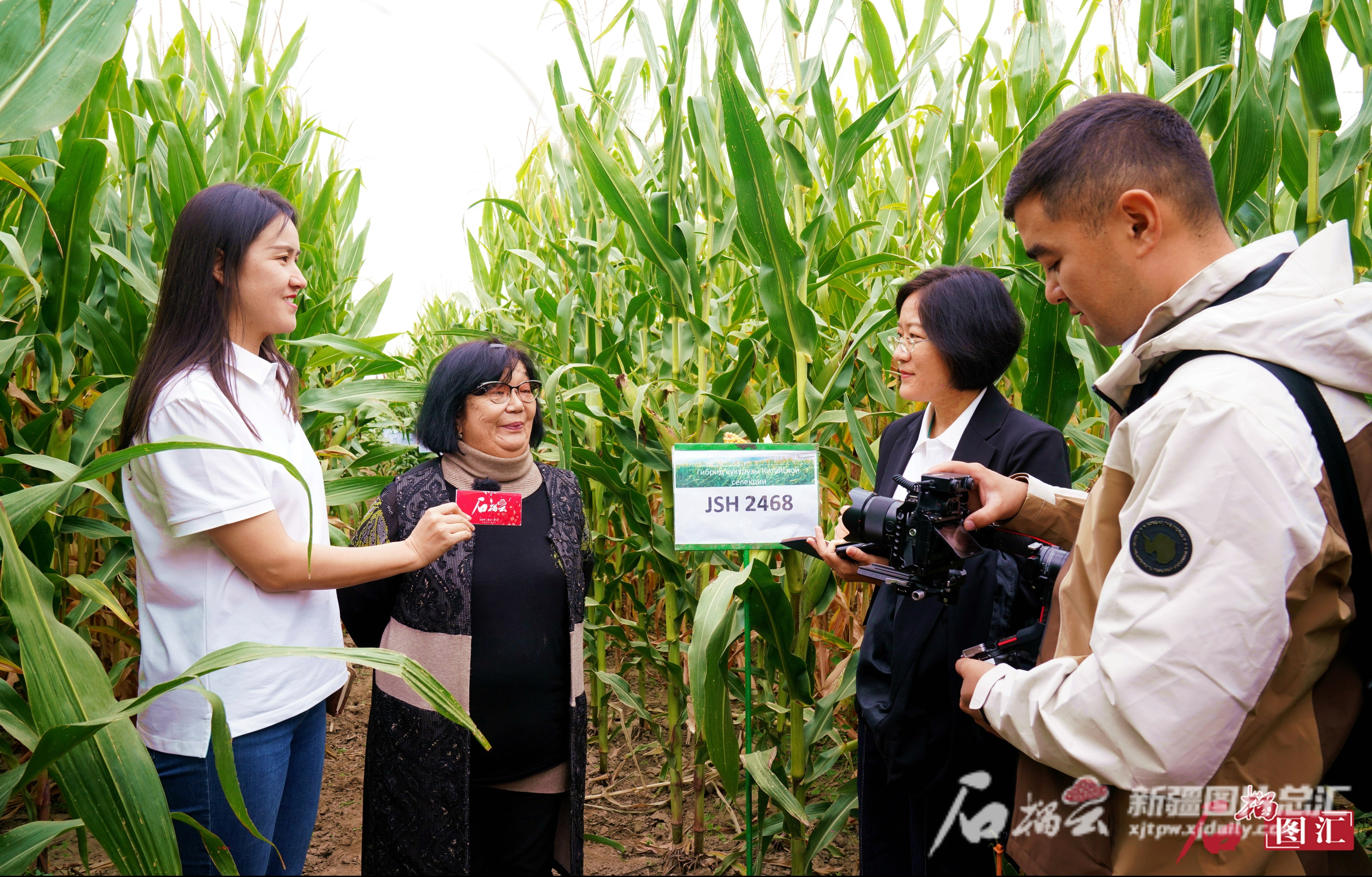 9月14日,记者在位于哈萨克斯坦阿拉木图市的九圣禾种业农作物展示示范基地,向哈萨克斯坦国家种植业与农作物生产研究所豆科作物和玉米实验室专家(左二)了解九圣禾2468玉米种子生长情况。石榴云/新疆日报记者 王琦铭摄