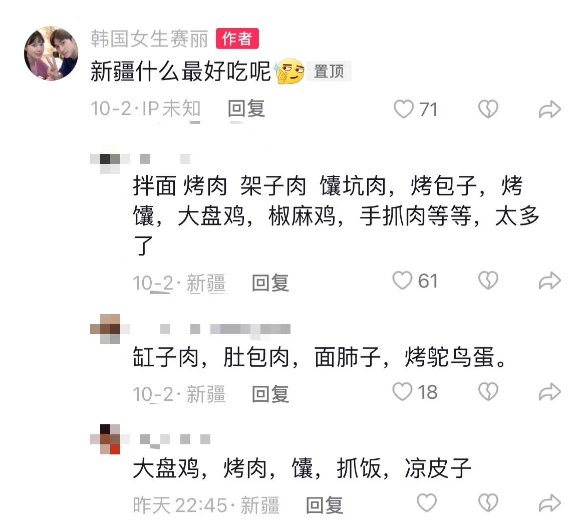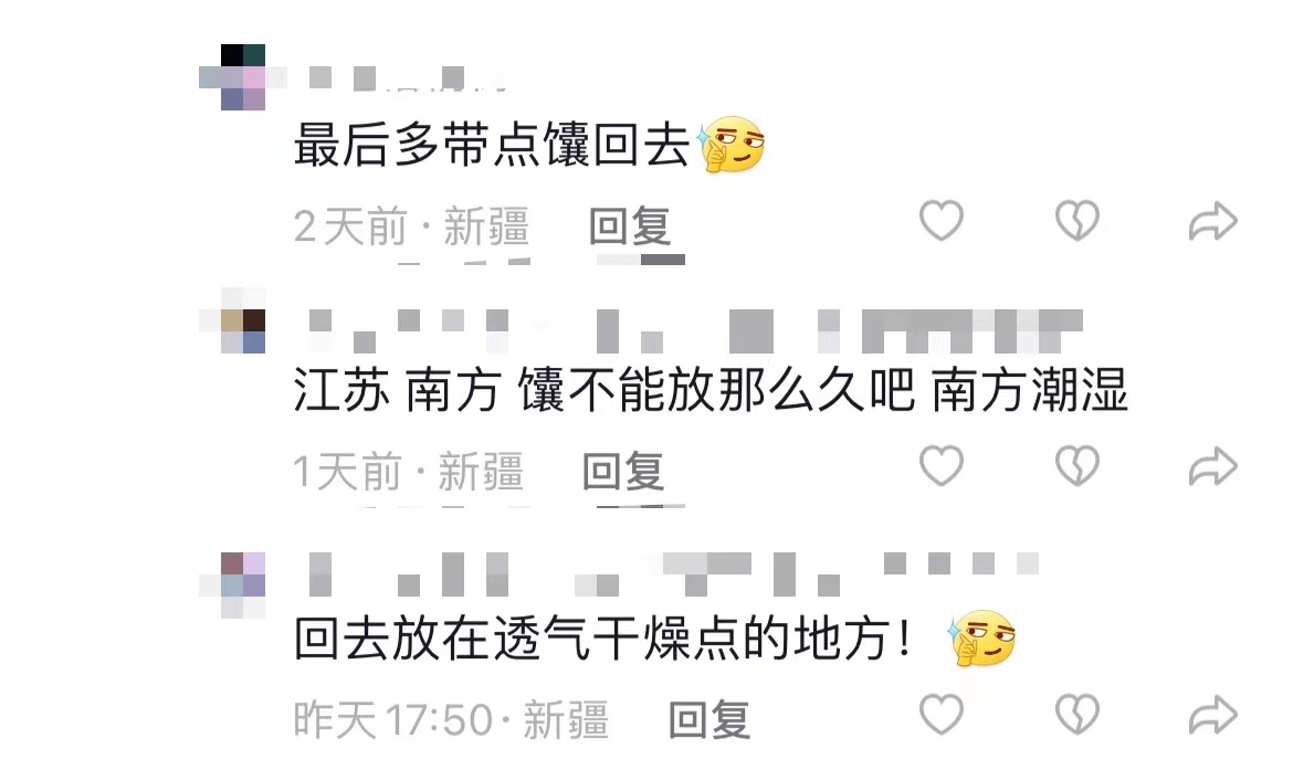 贺俊铨与赛丽还收到了很多网友的推荐,“来尉犁县吃正宗的烤全羊”“推荐沙湾的大盘鸡”“啥都好吃!”……还有热心网友在推荐馕之余,贴心指导南方来的朋友,将买回去的馕放在透气干燥的地方保存。在本次旅行结束,贺俊铨和赛丽也特意买了新疆当地的酸奶和馕带回家。