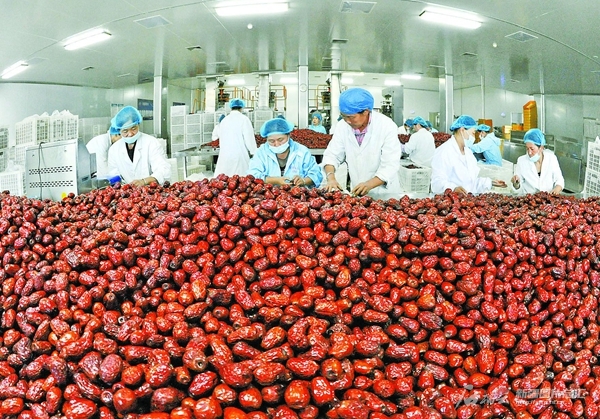 近日,位于若羌县的新疆羌都枣业股份有限公司生产车间内一条条自动化生产线正高效运转,工人们将红枣清洗、晾干、分拣、包装,一派忙碌的生产景象。近年来,若羌县大力实施红枣提质增效工程,红枣产业从种植到加工形成完整产业链。 天山网-新疆日报记者约提克尔·尼加提摄