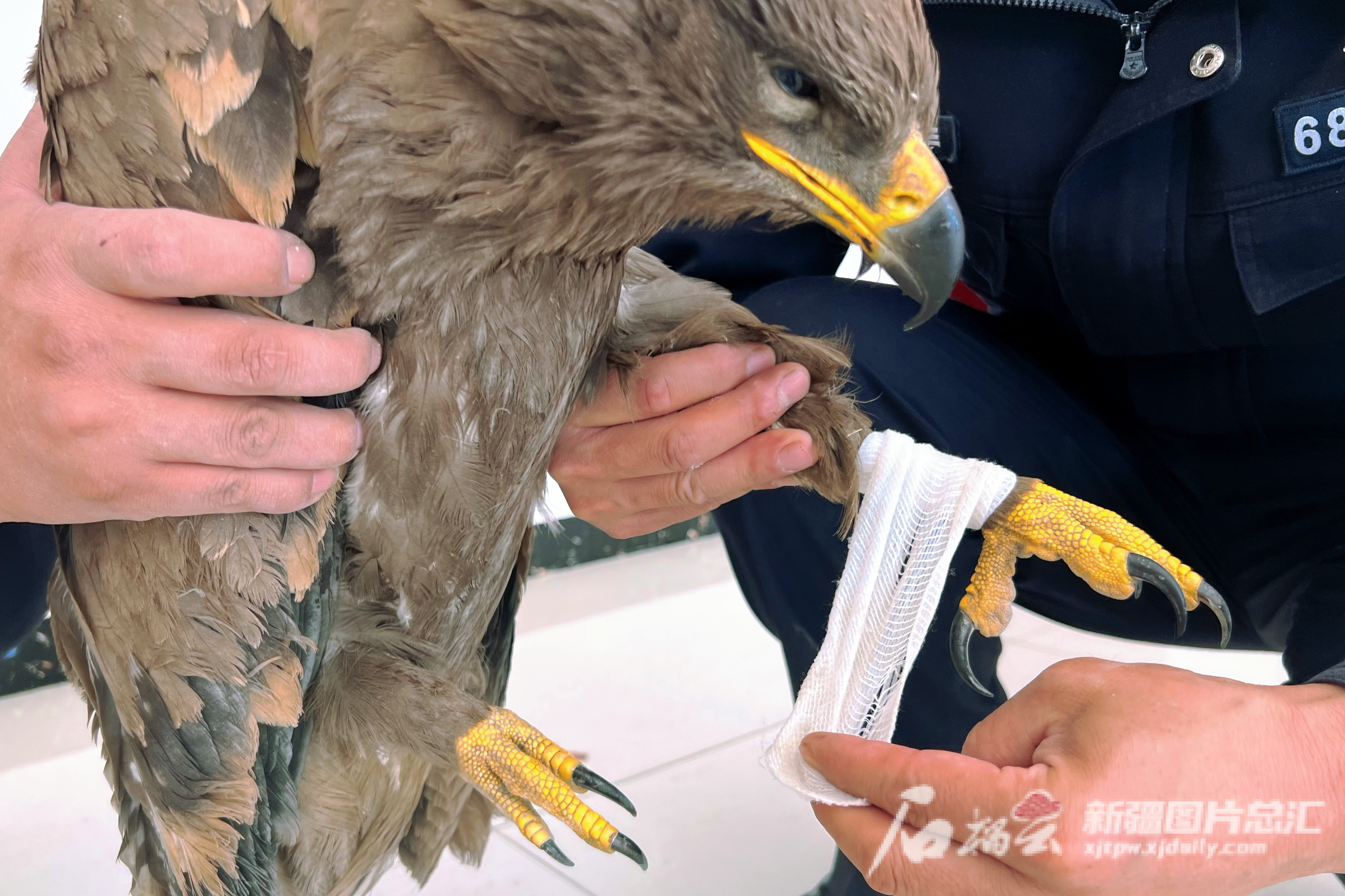 10月12日,岔哈泉边境派出所民警为金雕包扎伤口。张泽华摄