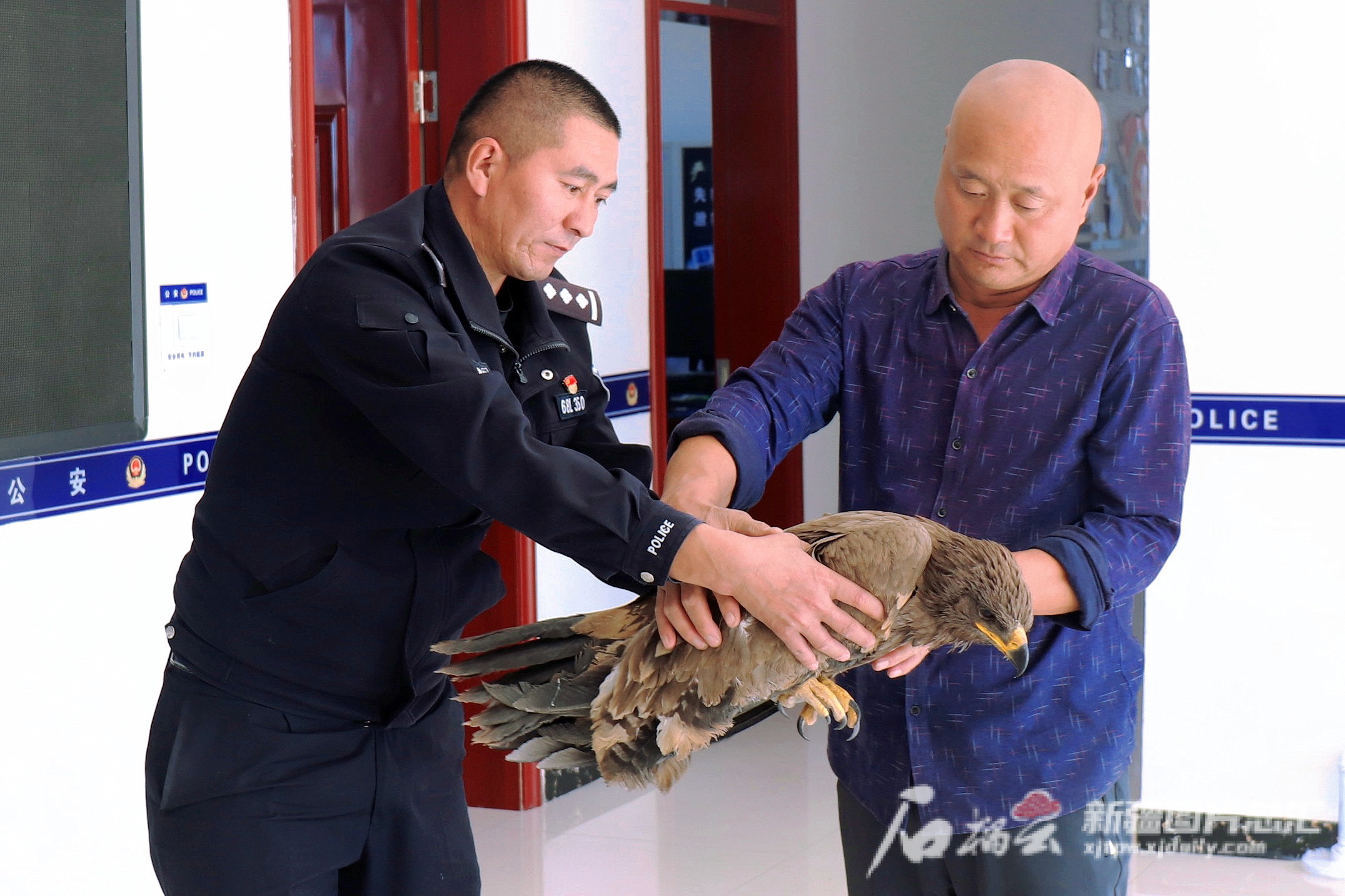 10月12日,民警将金雕移交给公益林管护站工作人员进行后期救助。张泽华摄