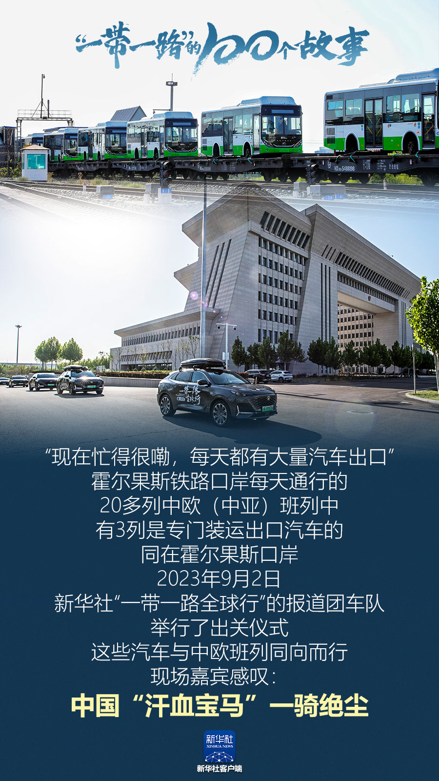 “现在忙得很嘞,每天都有大量汽车出口。”霍尔果斯铁路口岸每天通行的20多列中欧(中亚)班列中,有3列是专门装运出口汽车的。同在霍尔果斯口岸,2023年9月2日,新华社“一带一路全球行”的报道团车队举行了出关仪式。这些汽车与中欧班列同向而行,现场嘉宾感叹:中国“汗血宝马”一骑绝尘。(记者:赵戈)