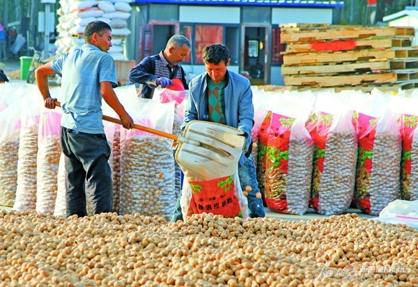 10月18日,工人在新和县核桃交易市场分装核桃。近年来,新和县持续打造农特产品种植、加工、销售产业链。 魏浩东摄