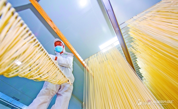 10月23日,工人在奇台县半截沟镇腰站子村农业产业园有机手工拉面车间制作挂面。近年来,该农业产业园生产的有机手工拉面、小杂粮等绿色有机食品深受市场青睐,畅销全国各地。 何龙摄