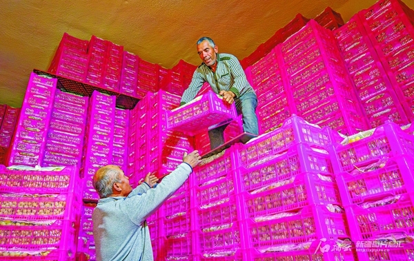 10月24日,阿图什市阿扎克镇翁艾日克村村民在冷链仓库码放木纳格葡萄。近年来,阿扎克镇为延长果蔬储存时间,已陆续建成保鲜库28座,年储存各类果蔬3.5万吨。 谢智摄