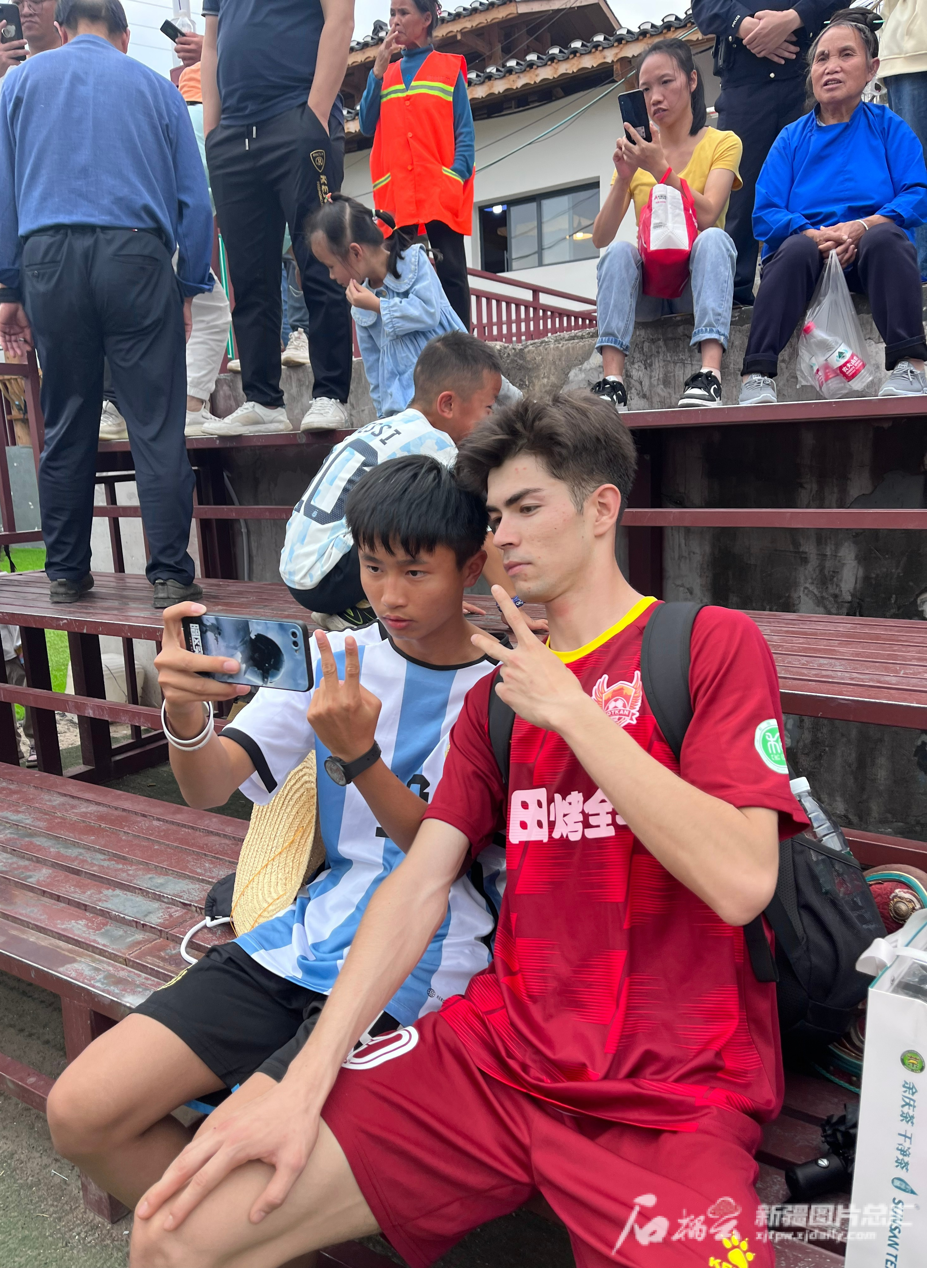 比赛结束后,贵州球迷张恩诚追到赛场边,与新疆烤全羊队队员合影留念。“哥哥们的比赛太精彩了,从开场到结束一直在努力组织进攻,这让我看到了最纯粹的足球拼搏精神,太感动了。”他是贵州三穗县的高一学生,跟随爸妈开车100多公里来看村超,“爸妈说高三毕业就带我去新疆,就去这个球队所在的和田玩。”