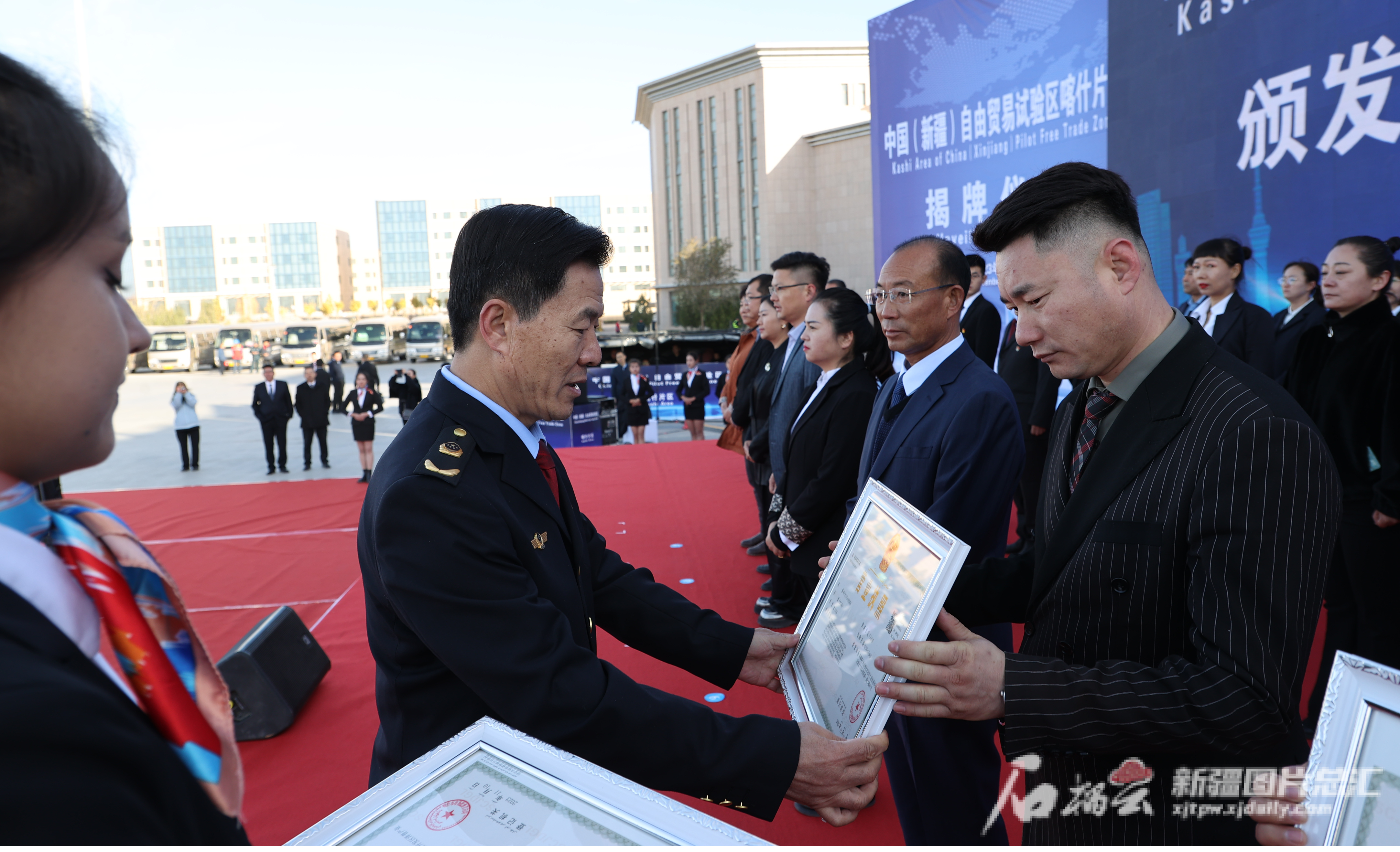 11月11日,喀什地区市场监督管理局党组书记、副局长侯德山(中)给首批入驻自贸试验区喀什片区的35家经营主体颁发营业执照。天山网-新疆日报记者 韩沁言摄
