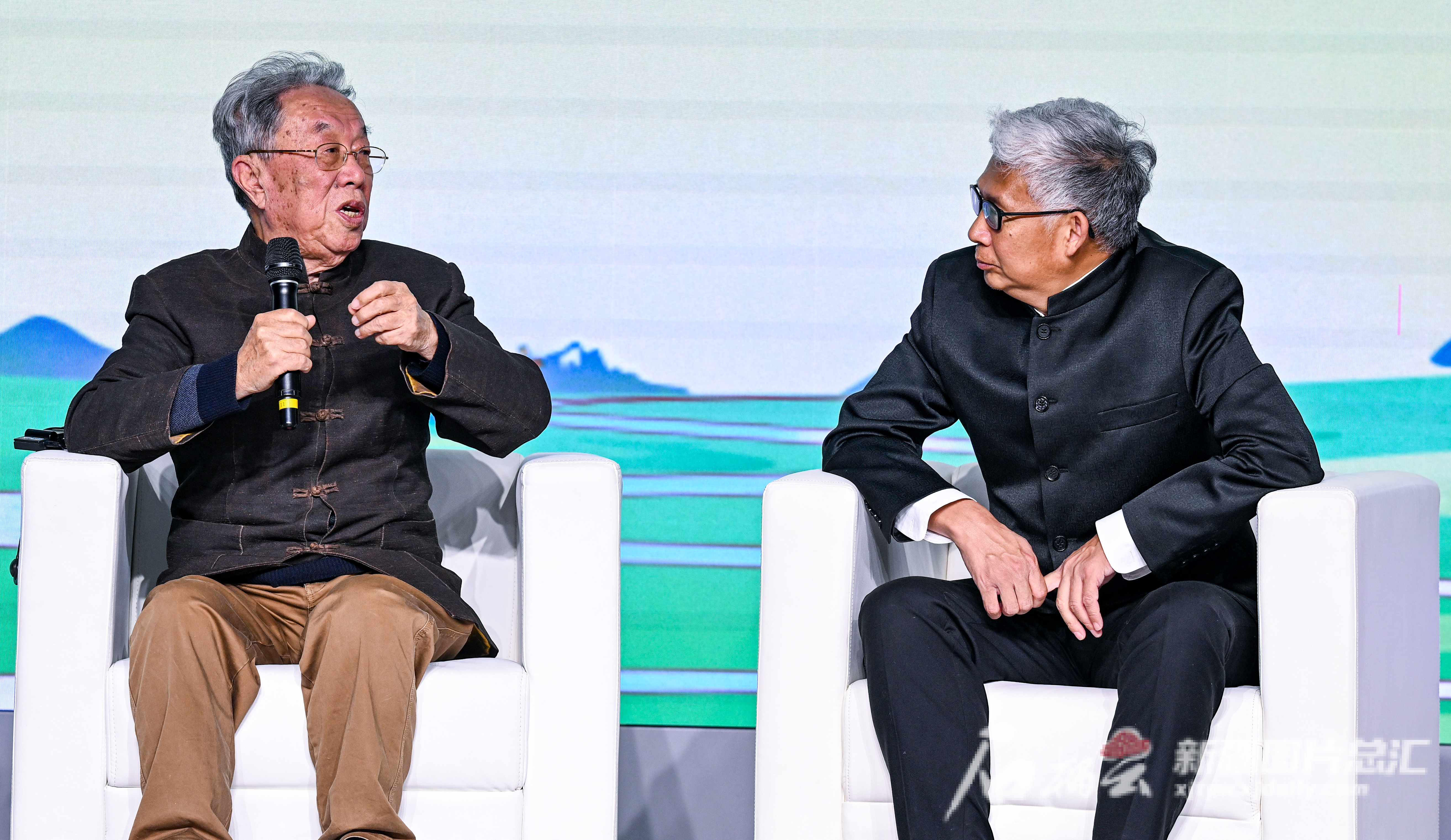 11月16日,著名作家、原文化部部长王蒙(左),历史学者、央视《百家讲坛》栏目主讲人、中国民生研究院特约研究员、北京师大二附中历史教师纪连海在分享会上讲述他们与新疆的故事。