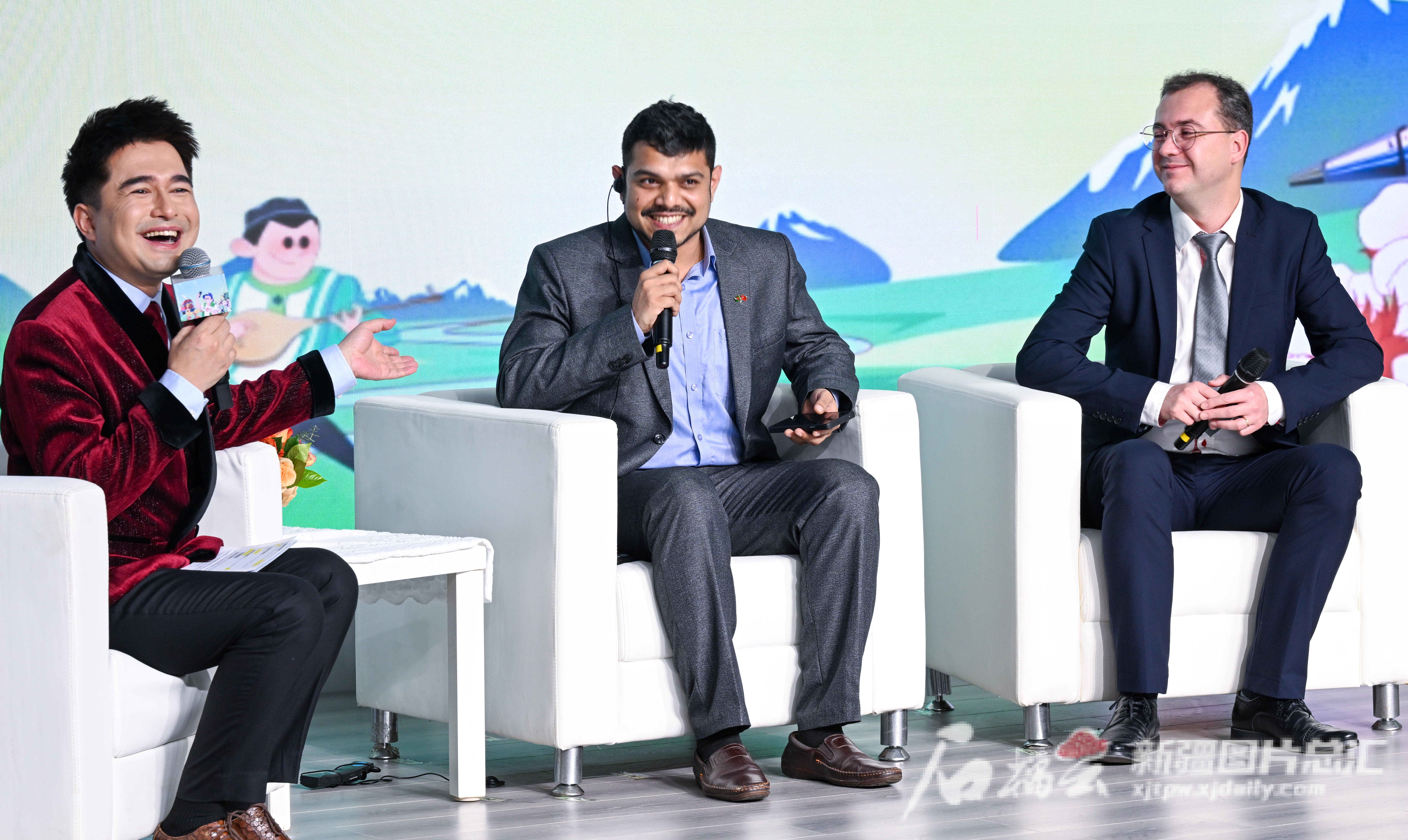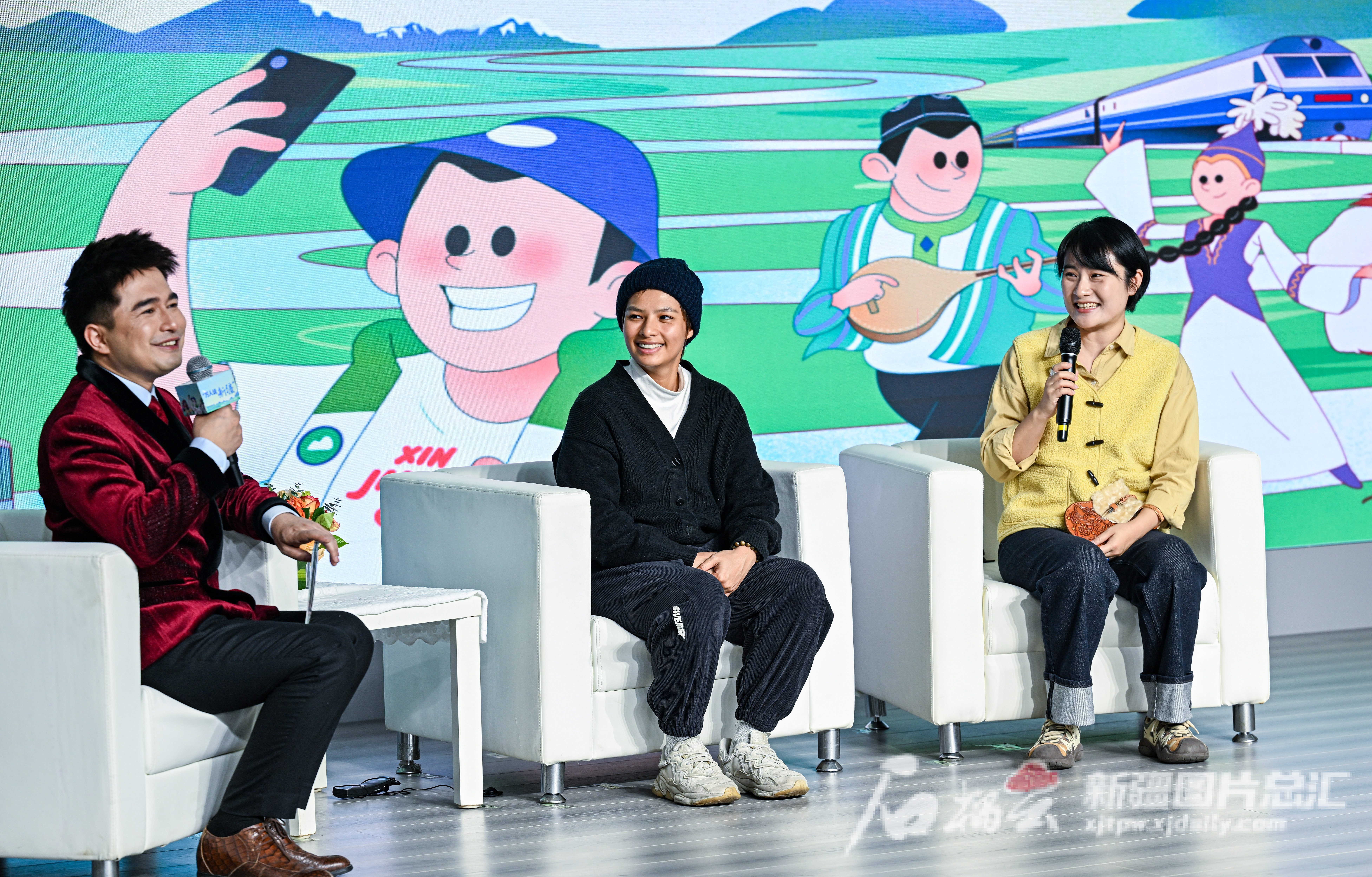 11月16日,采访类视频博主台湾帅玛莎(陈薇如)(中),乌鲁木齐市级皮雕非遗传承人孟璐璐(右),新疆广播电视台记者、新疆题材视频博主海米提·买买提(左)在分享会上讲述他们的新疆故事。