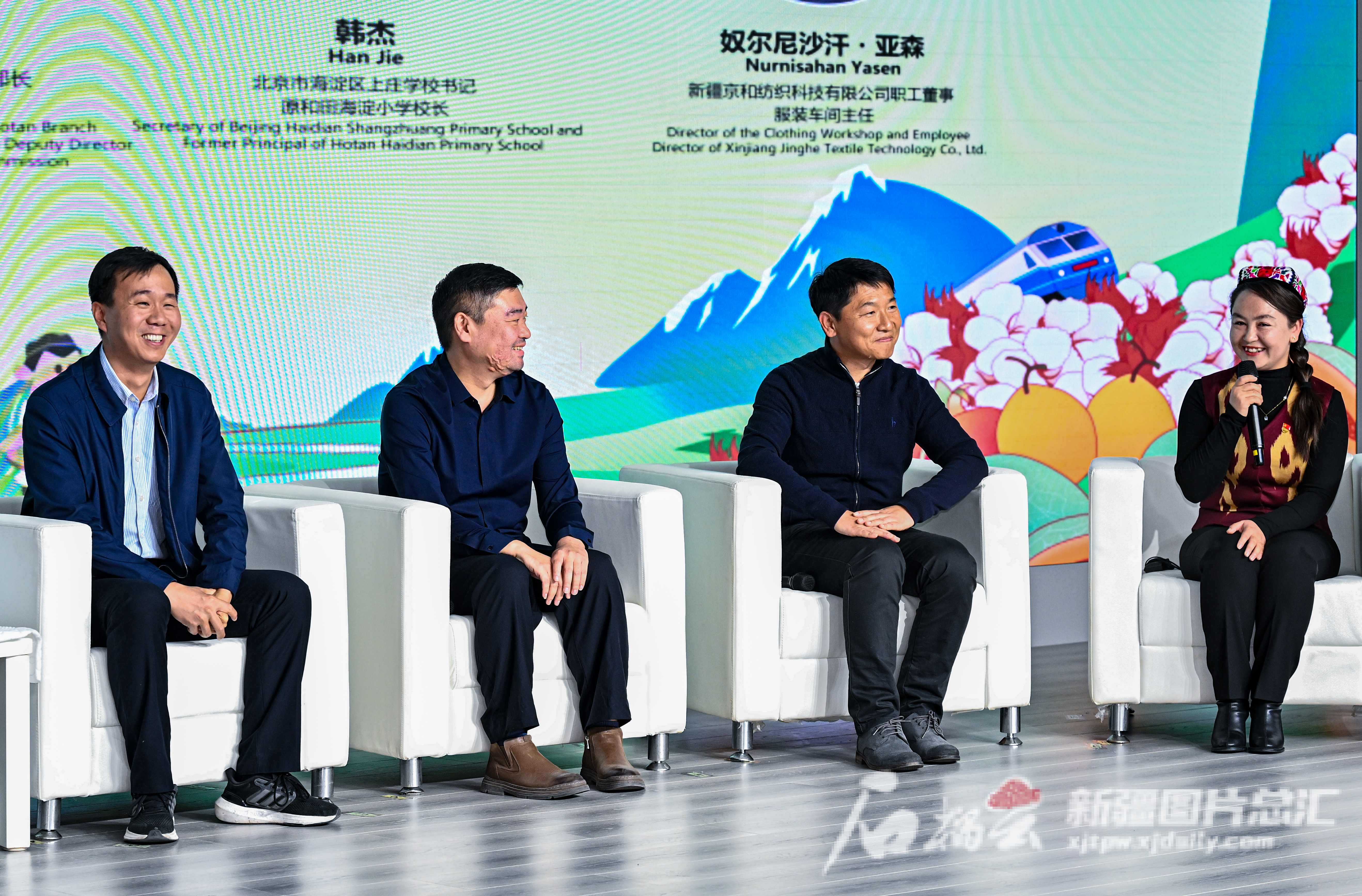 11月16日,北京市援疆和田指挥部办公室主任琚小红(左一),北京市援疆和田指挥部规划财务部副部长宋耀京(左二),和田市北京海淀小学校长韩杰(右二),新疆京和纺织科技有限公司职工董事、服装车间主任奴尔尼沙汗·亚森(右一)在分享会上讲述北京援疆的故事。