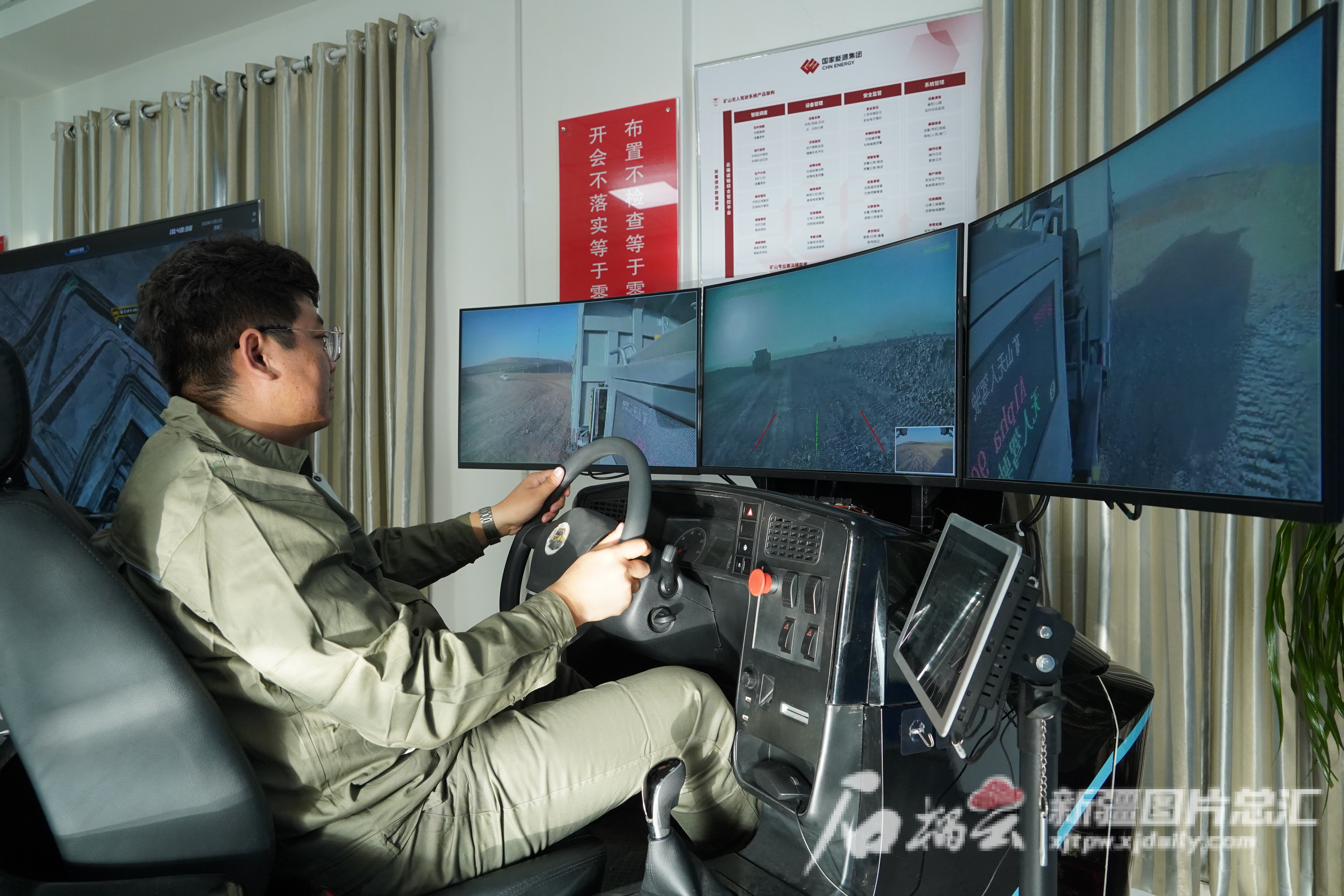 11月22日,工作人员在国家能源集团国神公司哈密大南湖二矿无人驾驶指挥中心远程操控矿山无人运输机器人。郭子毅摄