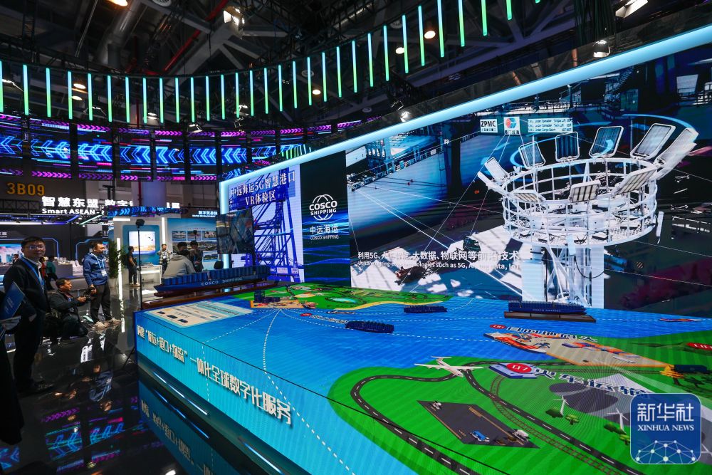 11月23日在第二届全球数字贸易博览会综合馆拍摄的“中远海运5G智慧港口VR体验区”。