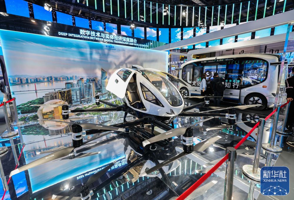 11月23日,在第二届全球数字贸易博览会综合馆内拍摄的飞行器和无人机驾驶汽车。