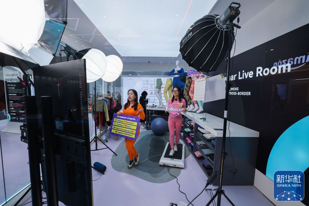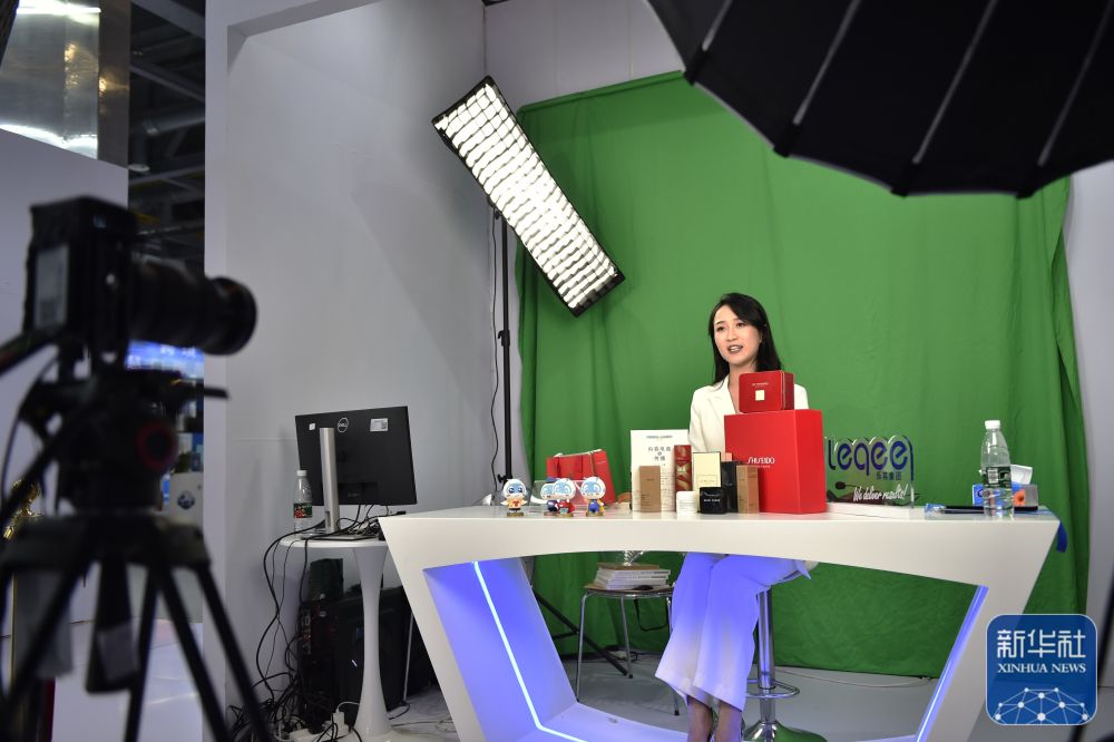 11月23日,在第二届全球数字贸易博览会的丝路电商馆,跨境电商进行直播销售。