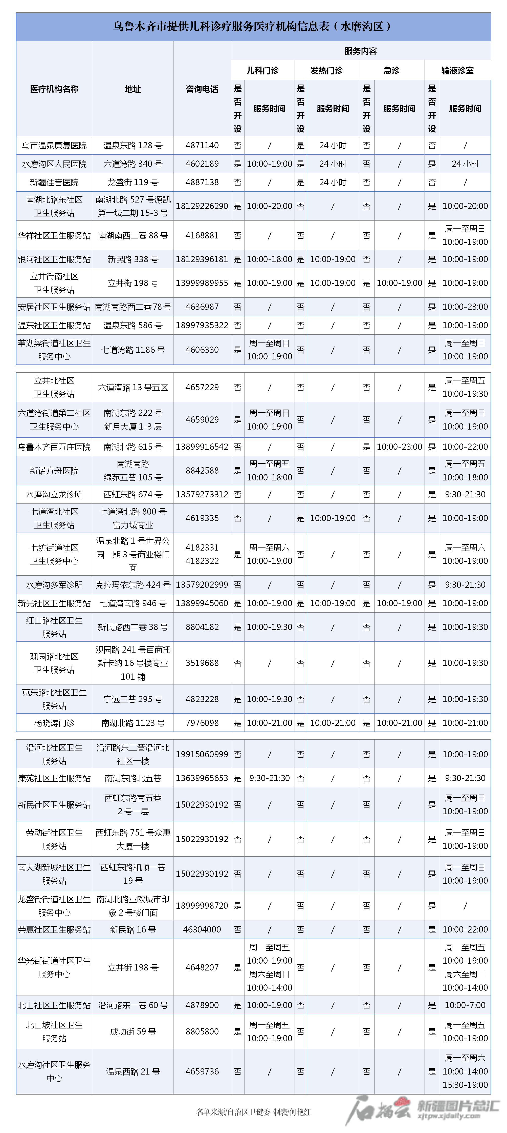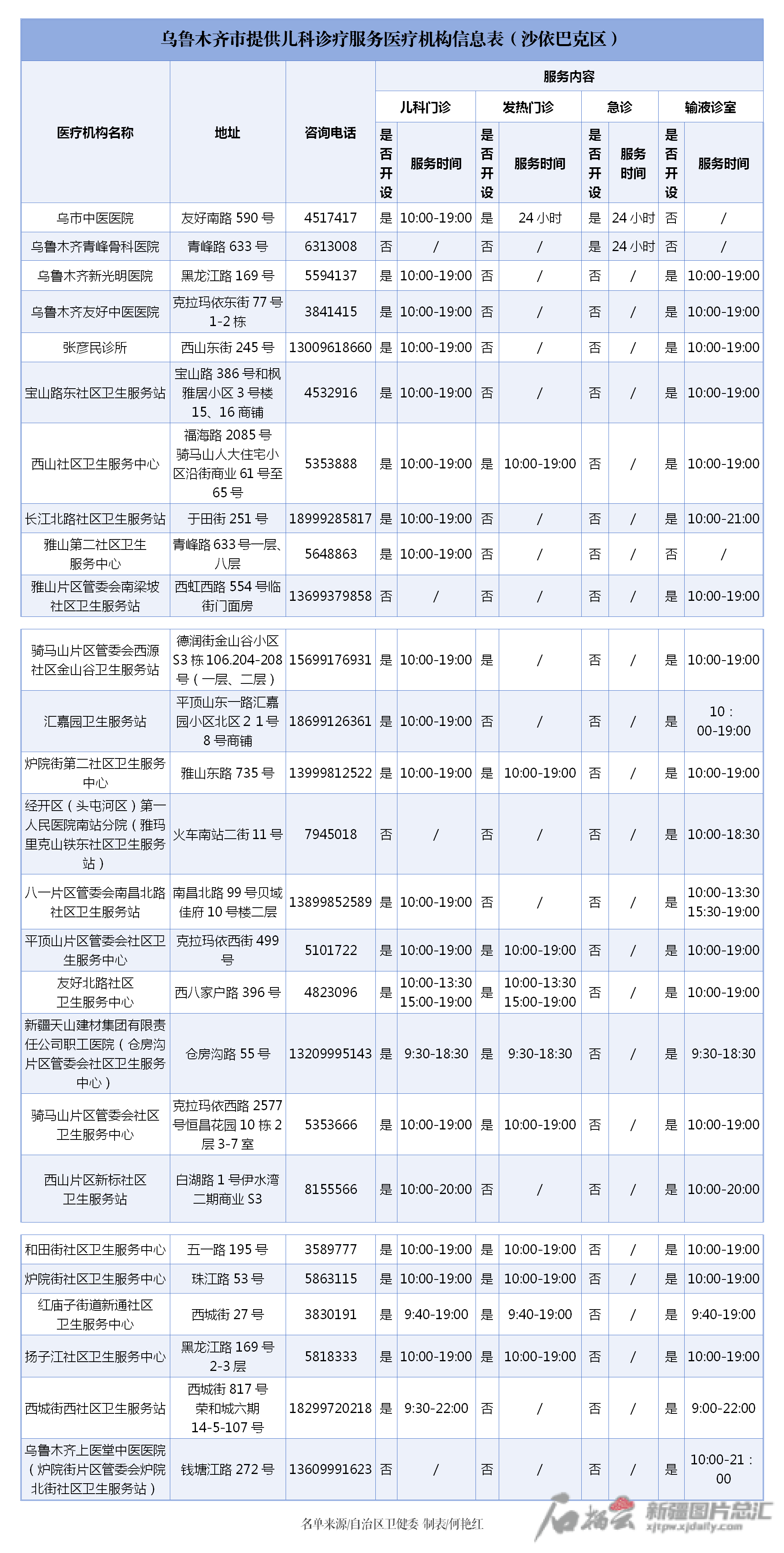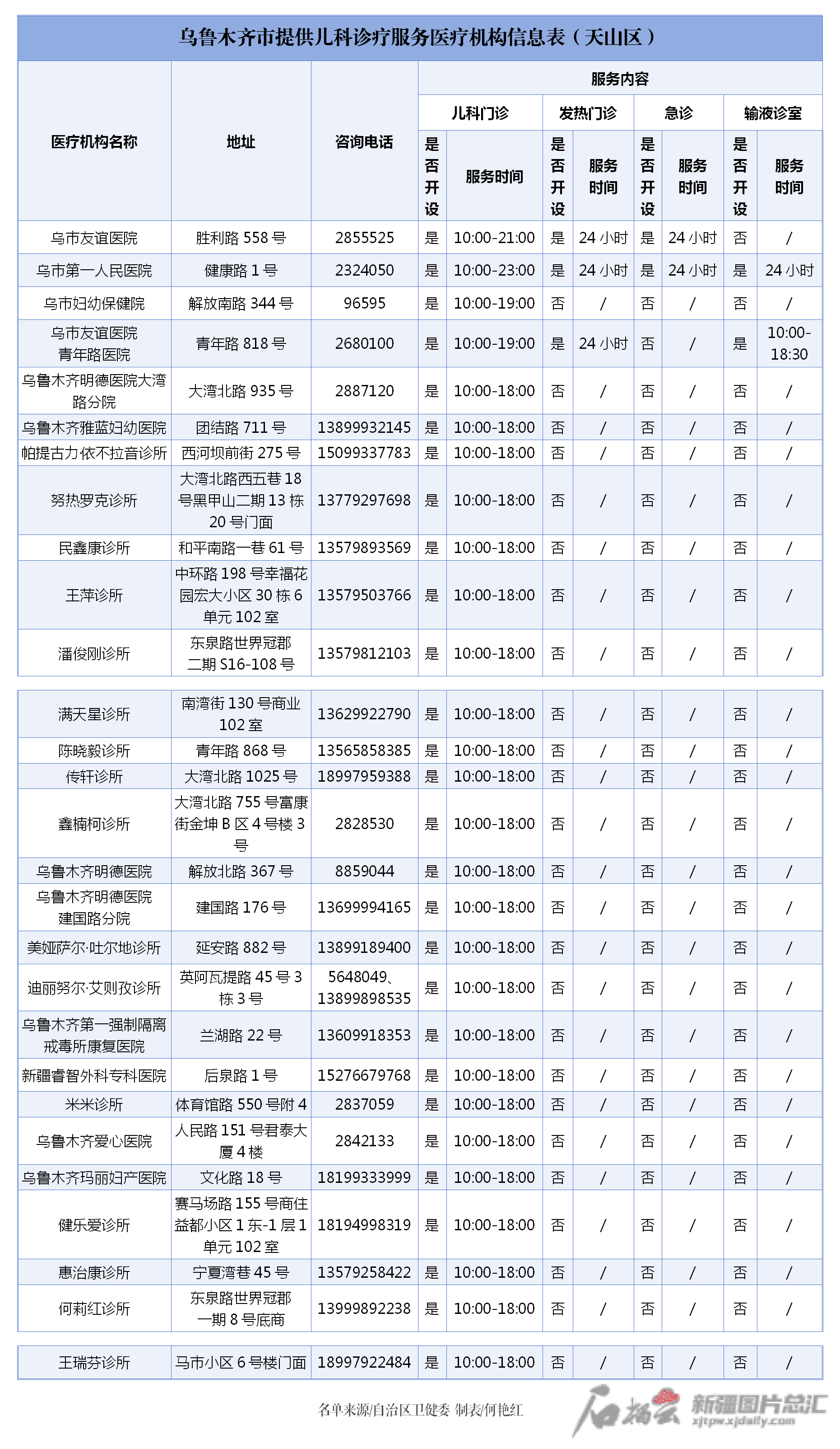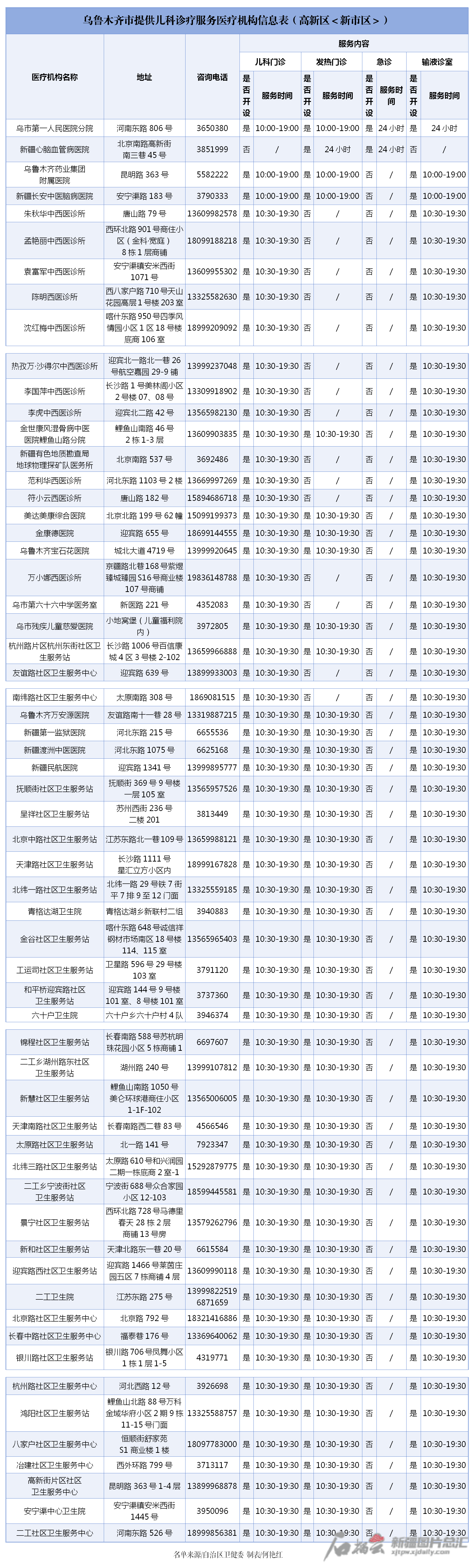 信息表显示,位于乌鲁木齐的医疗机构包括一二三级以及基层医疗机构、诊所。信息表对各医疗机构地址、电话、诊疗服务内容以及服务时间进行了梳理,市民朋友可根据需求,选择医疗机构或诊所就近就便就医。