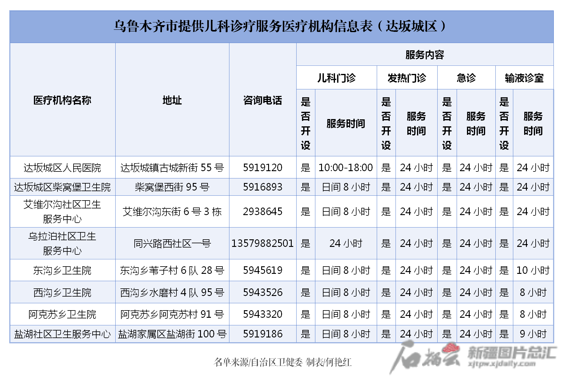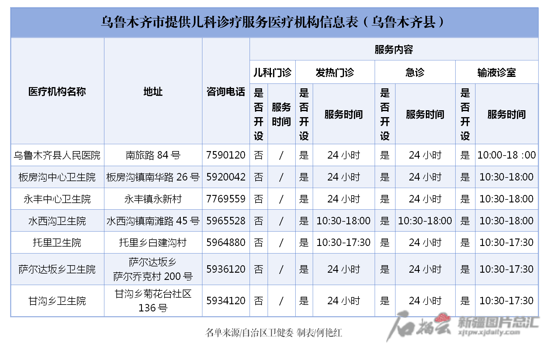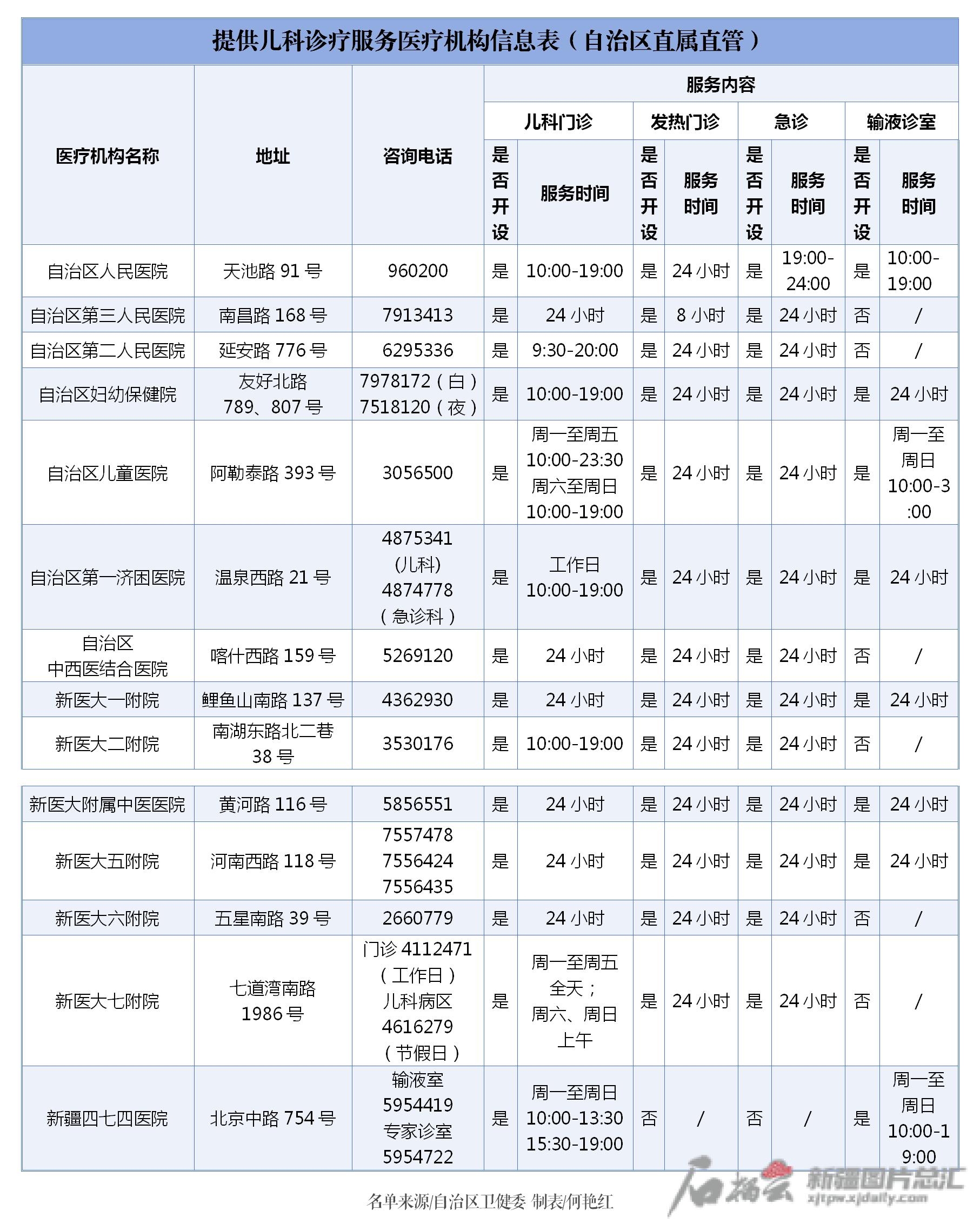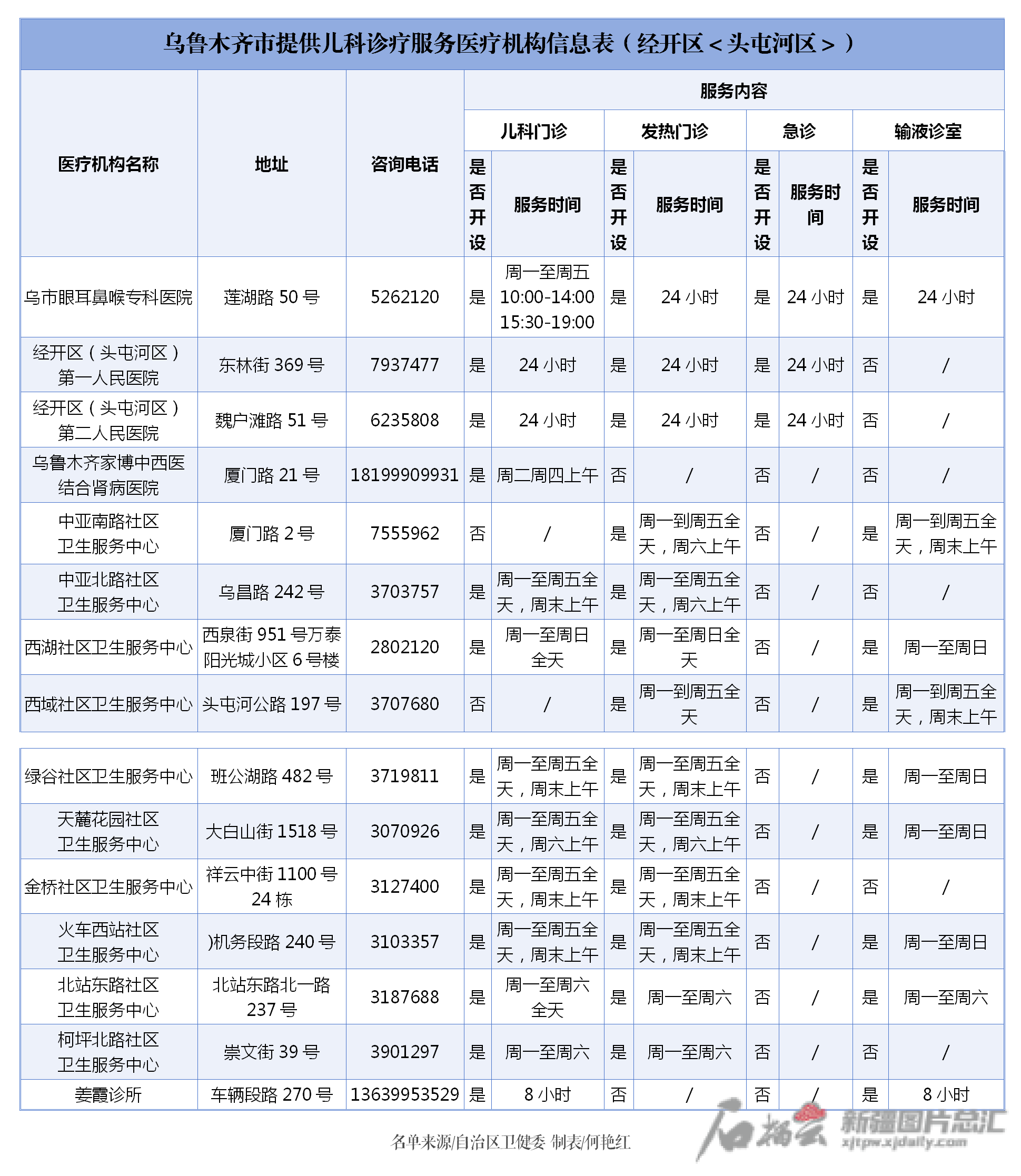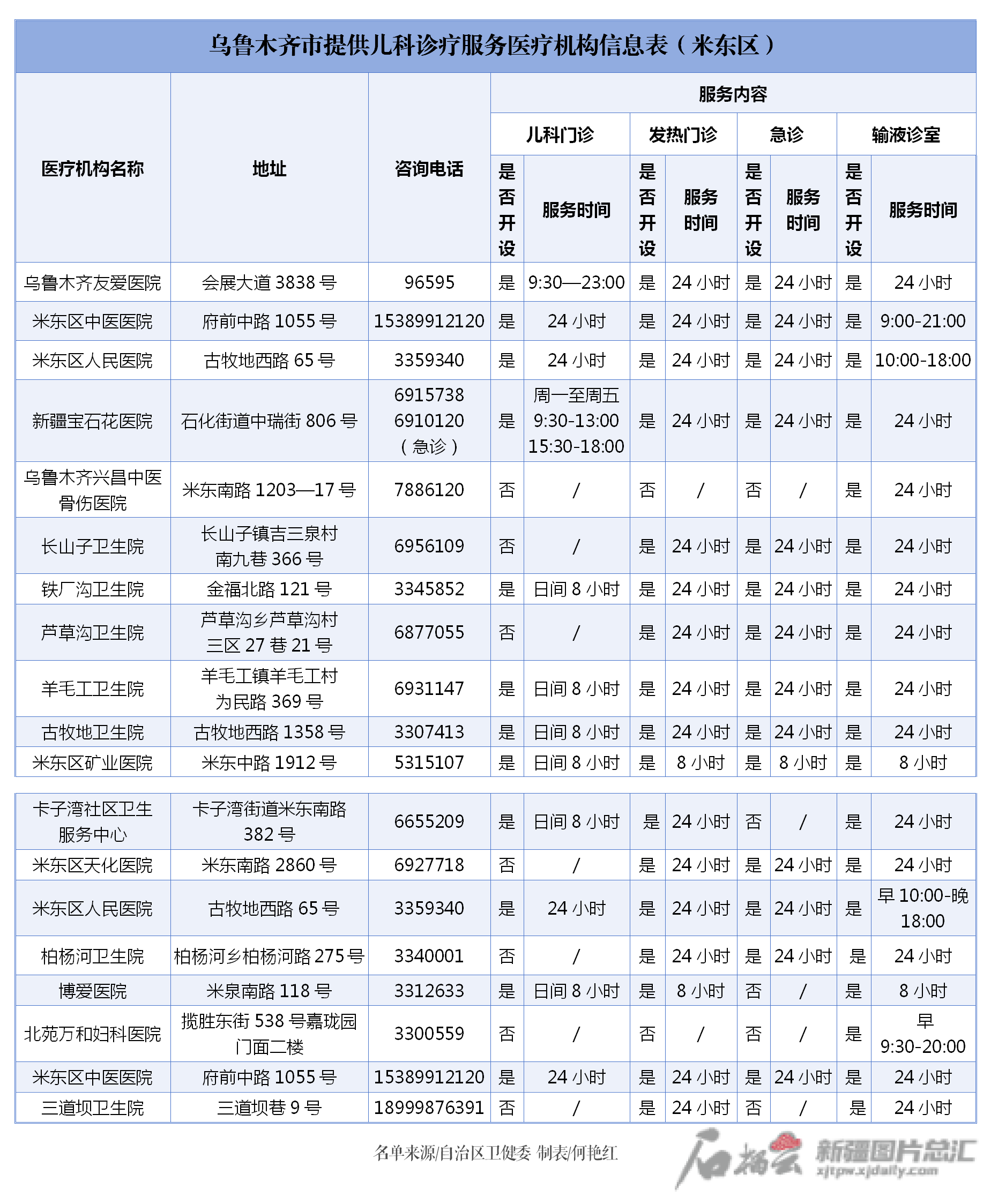 信息表显示,位于乌鲁木齐的医疗机构包括一二三级以及基层医疗机构、诊所。信息表对各医疗机构地址、电话、诊疗服务内容以及服务时间进行了梳理,市民朋友可根据需求,选择医疗机构或诊所就近就便就医。