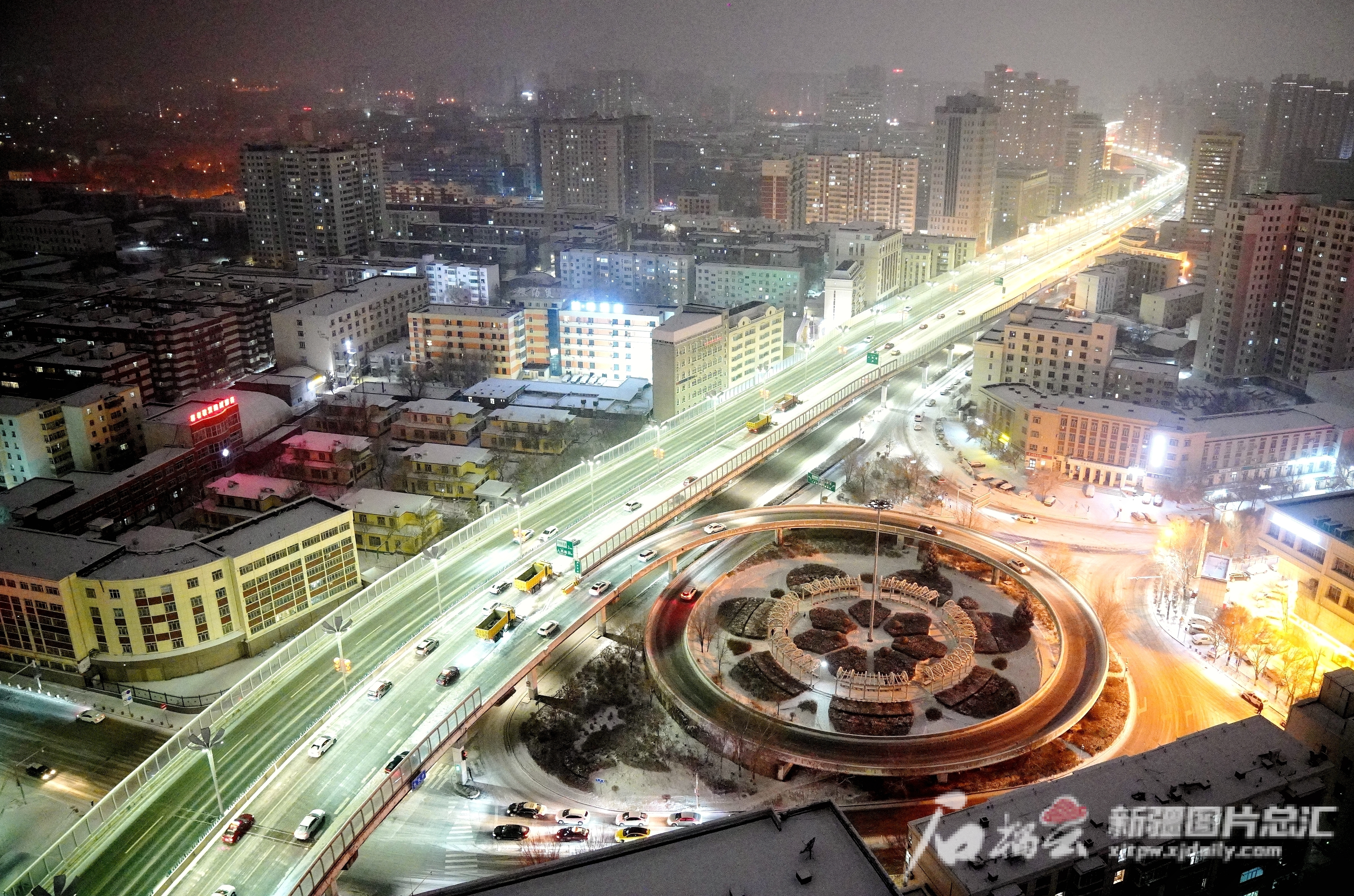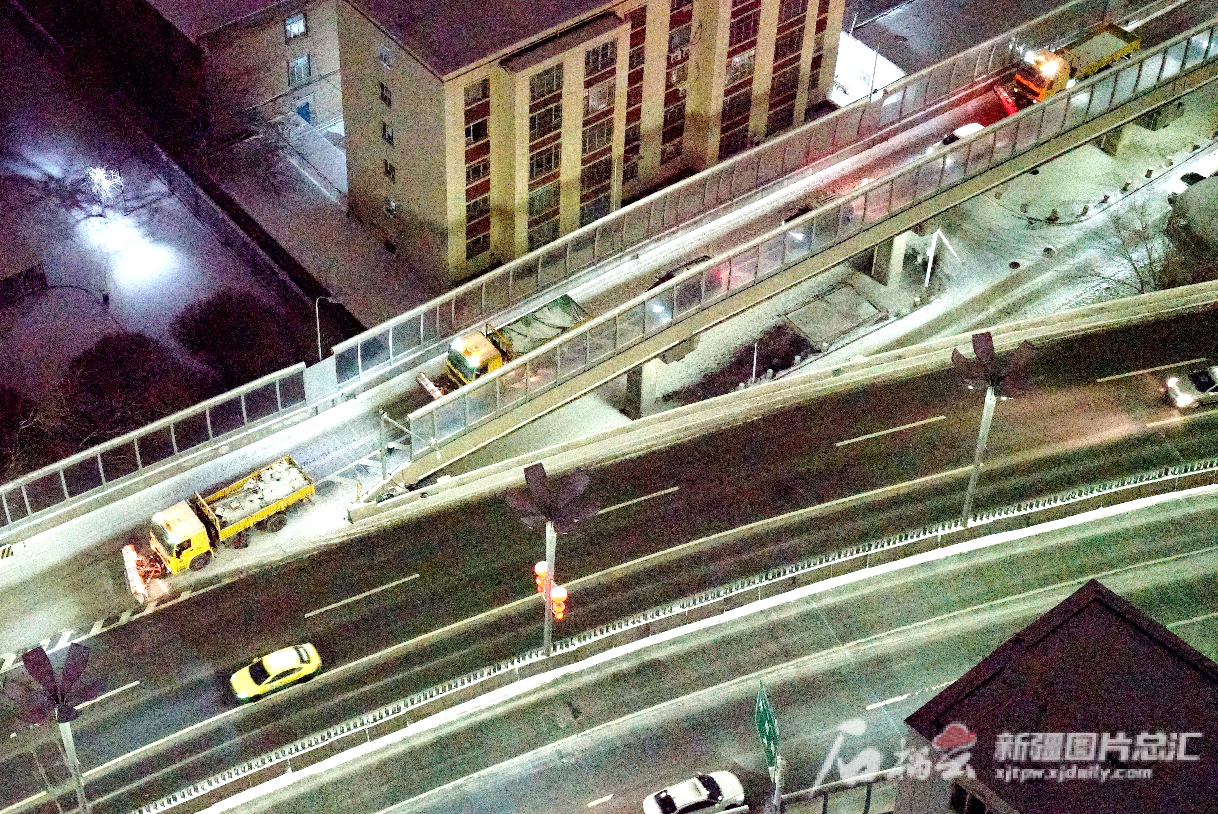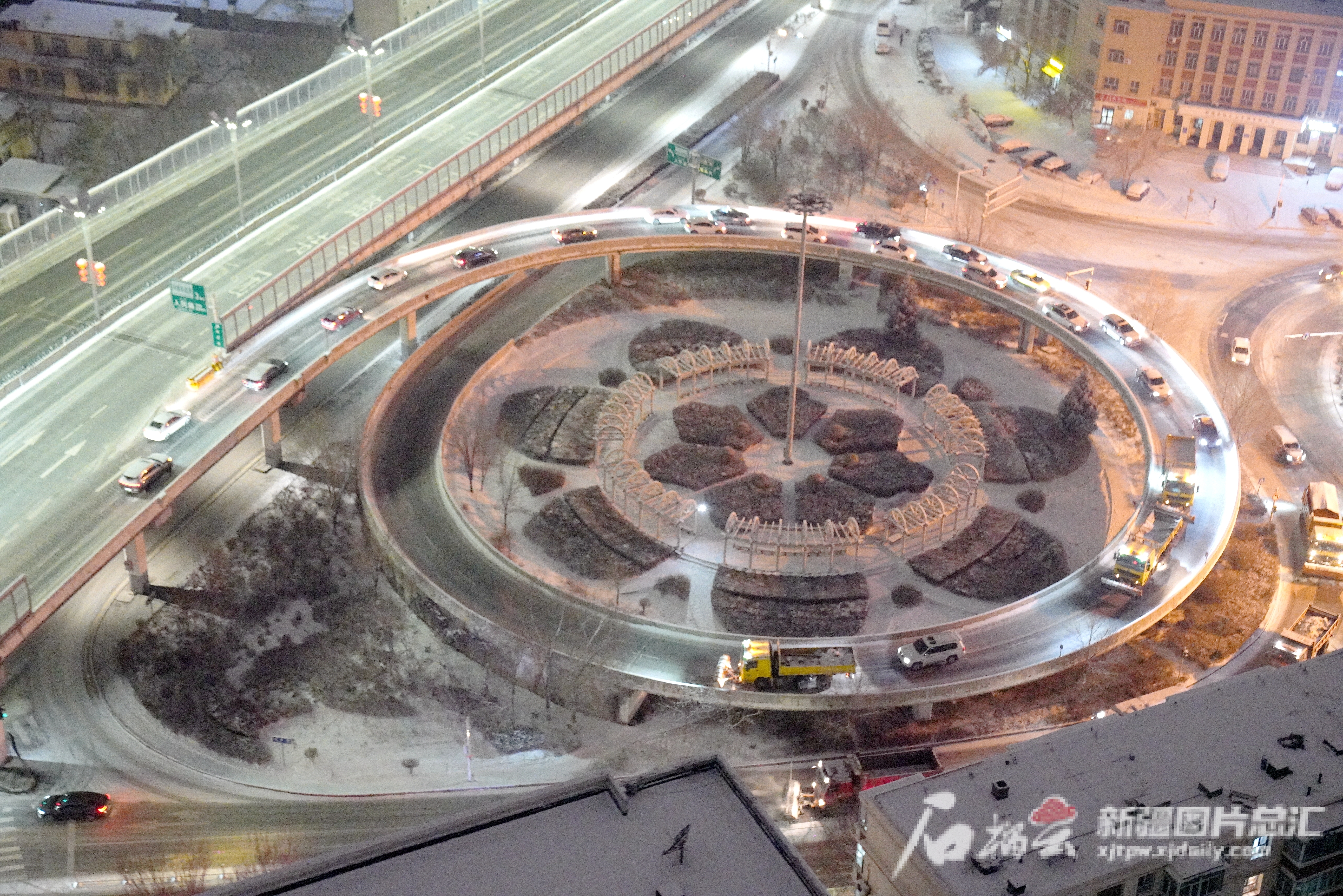 12月9日23时19分,乌鲁木齐市天山区环卫清运队清雪机械在东外环东风桥路段作业。石榴云/新疆日报记者 王琦铭摄