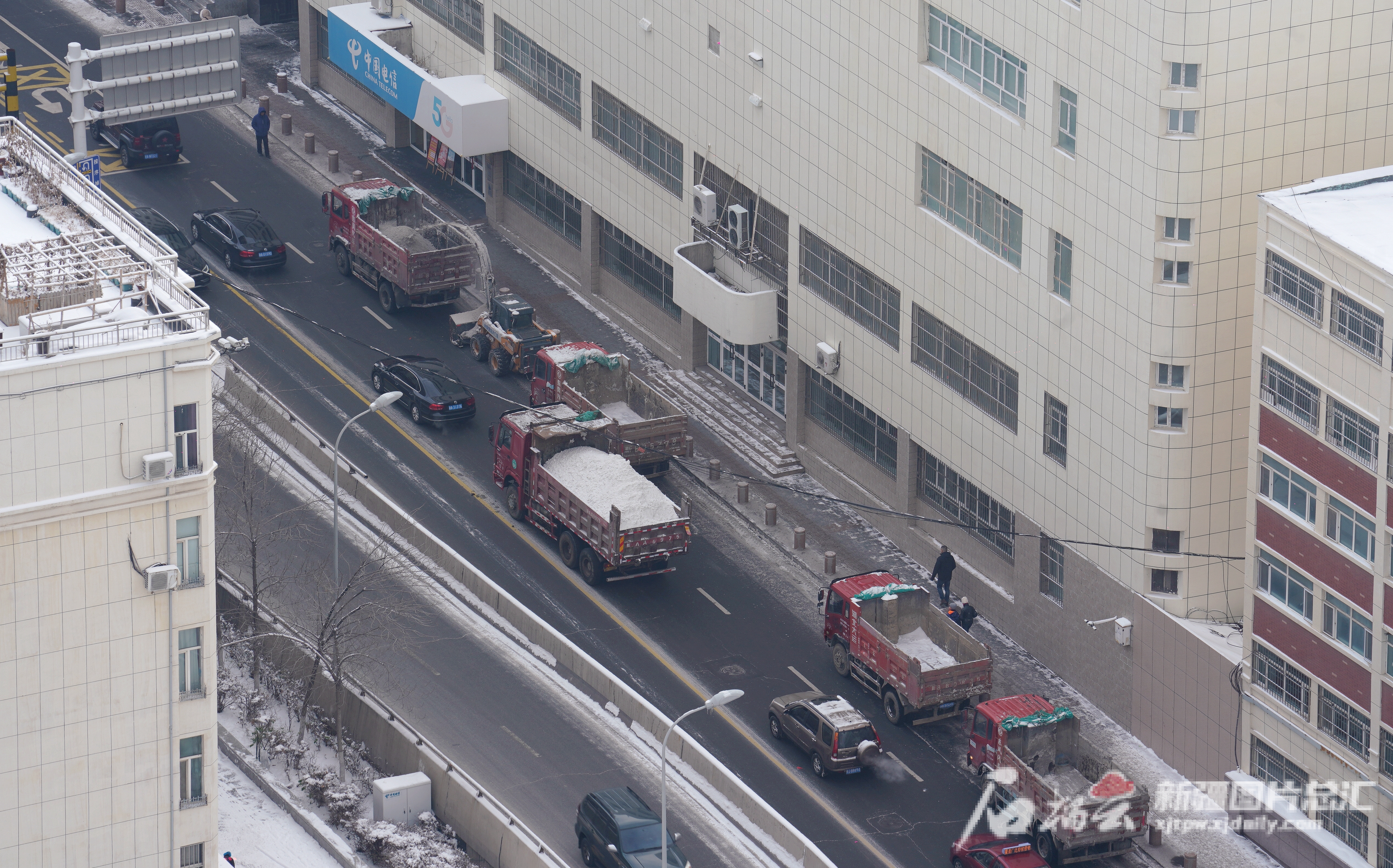 12月10日12时21分,乌鲁木齐市天山区环卫清运队在东后街将路面清扫出来的冰雪装运出城。石榴云/新疆日报记者 王琦铭摄