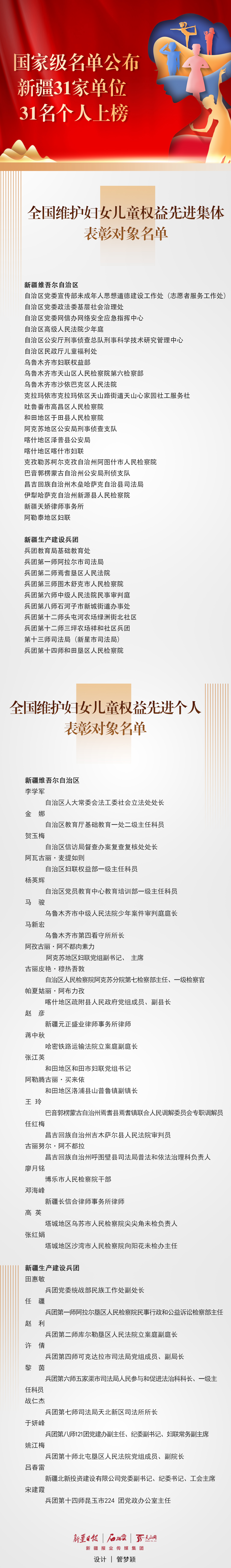 石榴云/新疆日报讯(记者 管梦颖报道)12月11日,记者从自治区妇联获悉:全国妇联印发《关于表彰全国维护妇女儿童权益先进集体和先进个人的决定》,新疆(含兵团)31家单位和31名个人获全国维护妇女儿童权益先进集体和先进个人称号。
