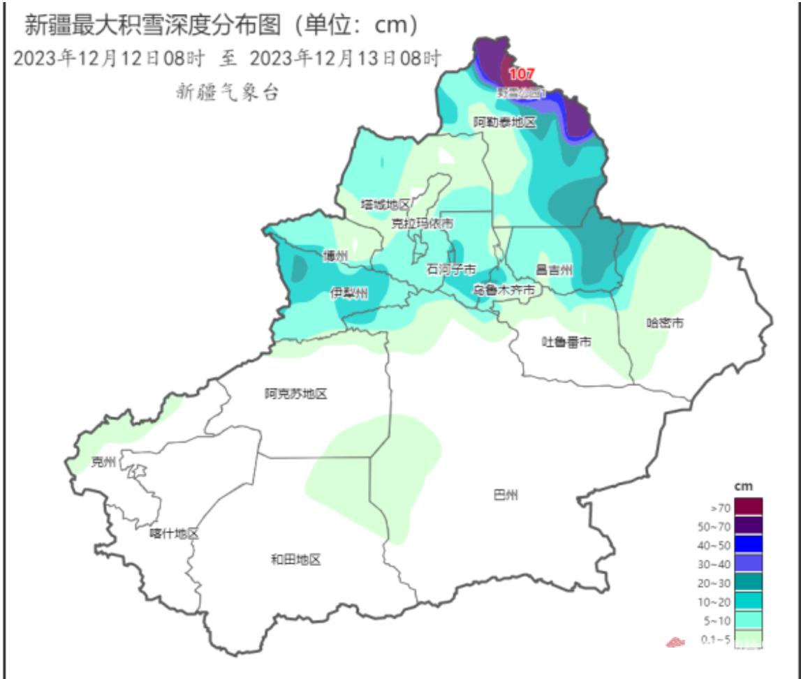12月12日8时—13日8时新疆最大积雪深度分布图。(新疆气象台 供图)