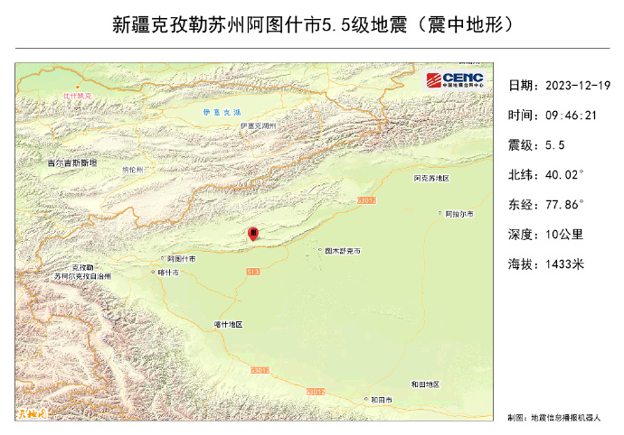 据中国地震台网正式测定:12月19日09时46分在新疆克州阿图什市(北纬40.02度,东经77.86度)发生5.5级地震,震源深度10千米。据悉,地震区域人口极其稀少,周边乡镇目前没有警情。