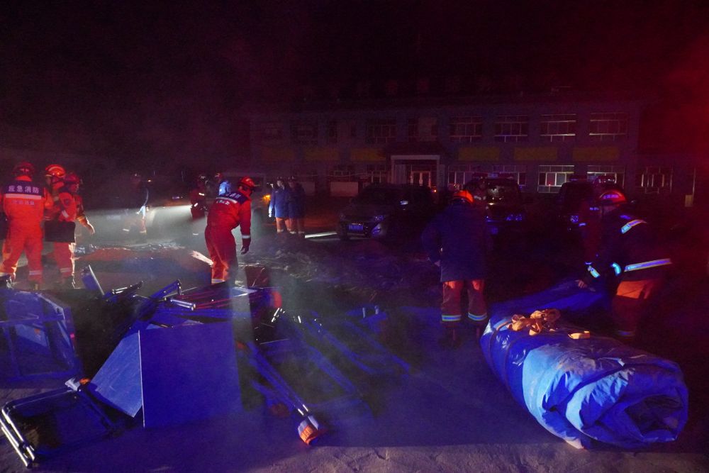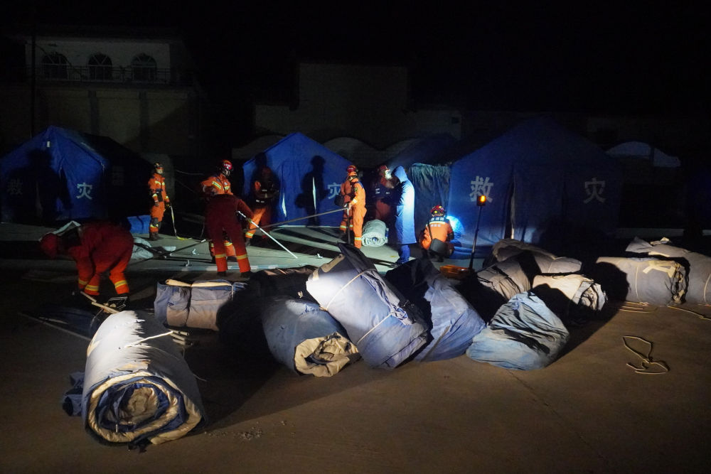 12月19日,在甘肃省临夏回族自治州积石山保安族东乡族撒拉族自治县大河家镇大河村,消防人员搭建救灾帐篷。新华社记者 马希平 摄