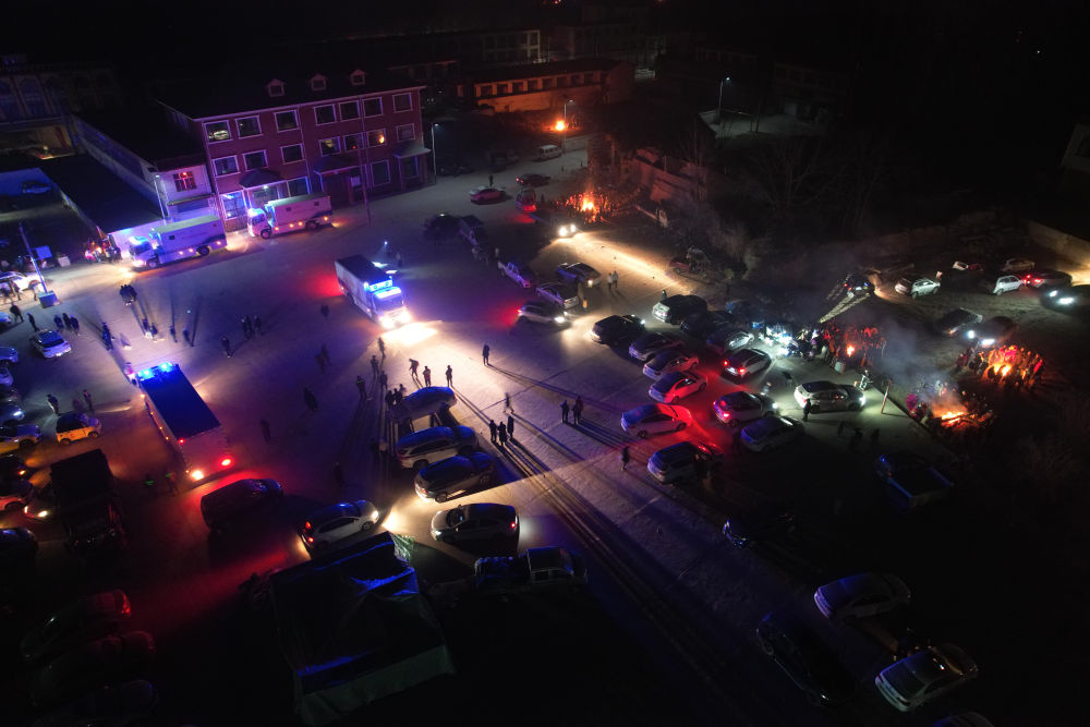 12月19日,在甘肃省临夏回族自治州积石山保安族东乡族撒拉族自治县大河家镇大河村,多方力量开展救援(无人机照片)。新华社记者 张睿 摄