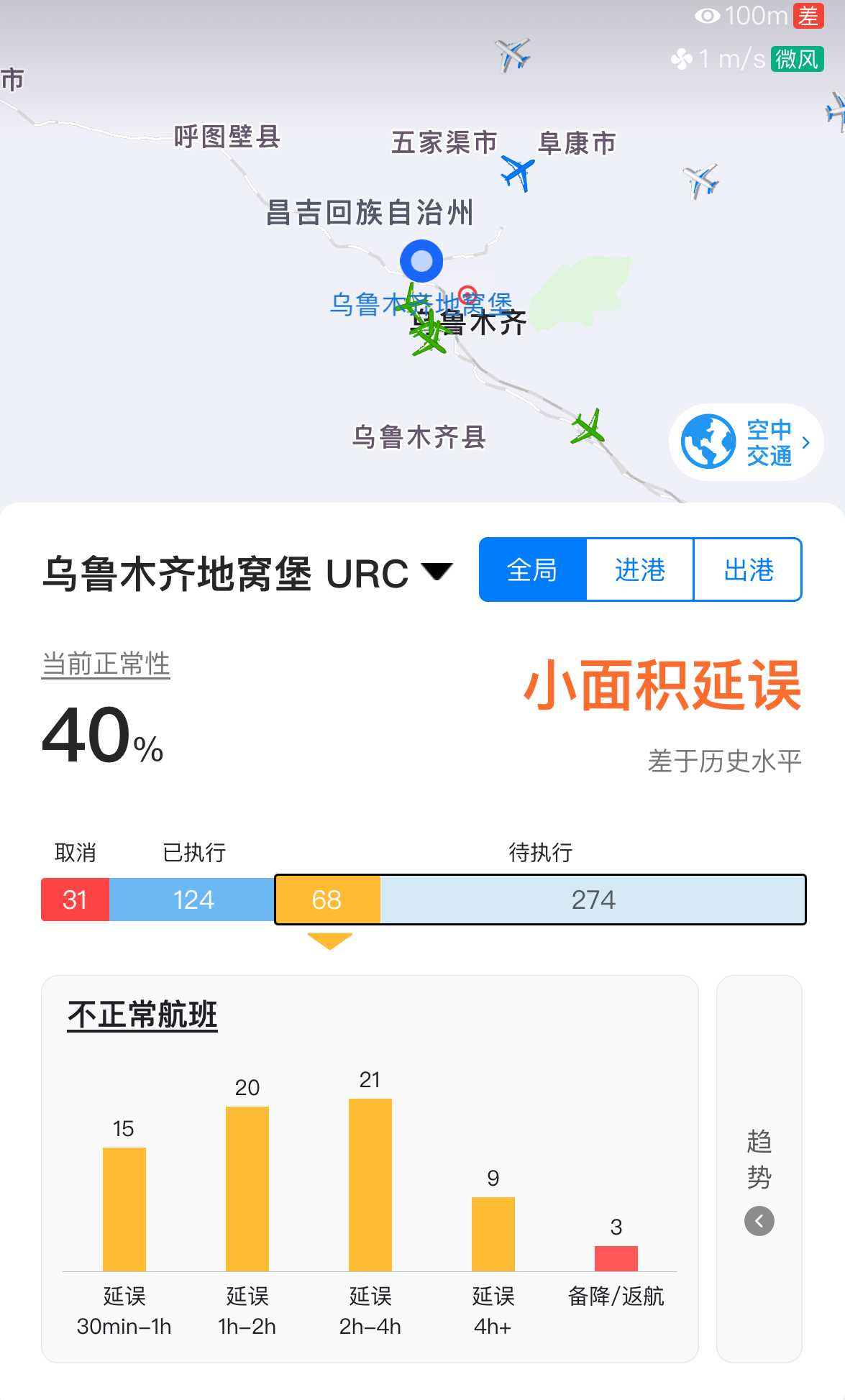 截至10时30分,乌鲁木齐地窝堡国际机场实际保障航班54架次(出港54架次,进港0架次),取消1架次,因天气原因备降3架次(国际航班),均备降于喀什徕宁国际机场。