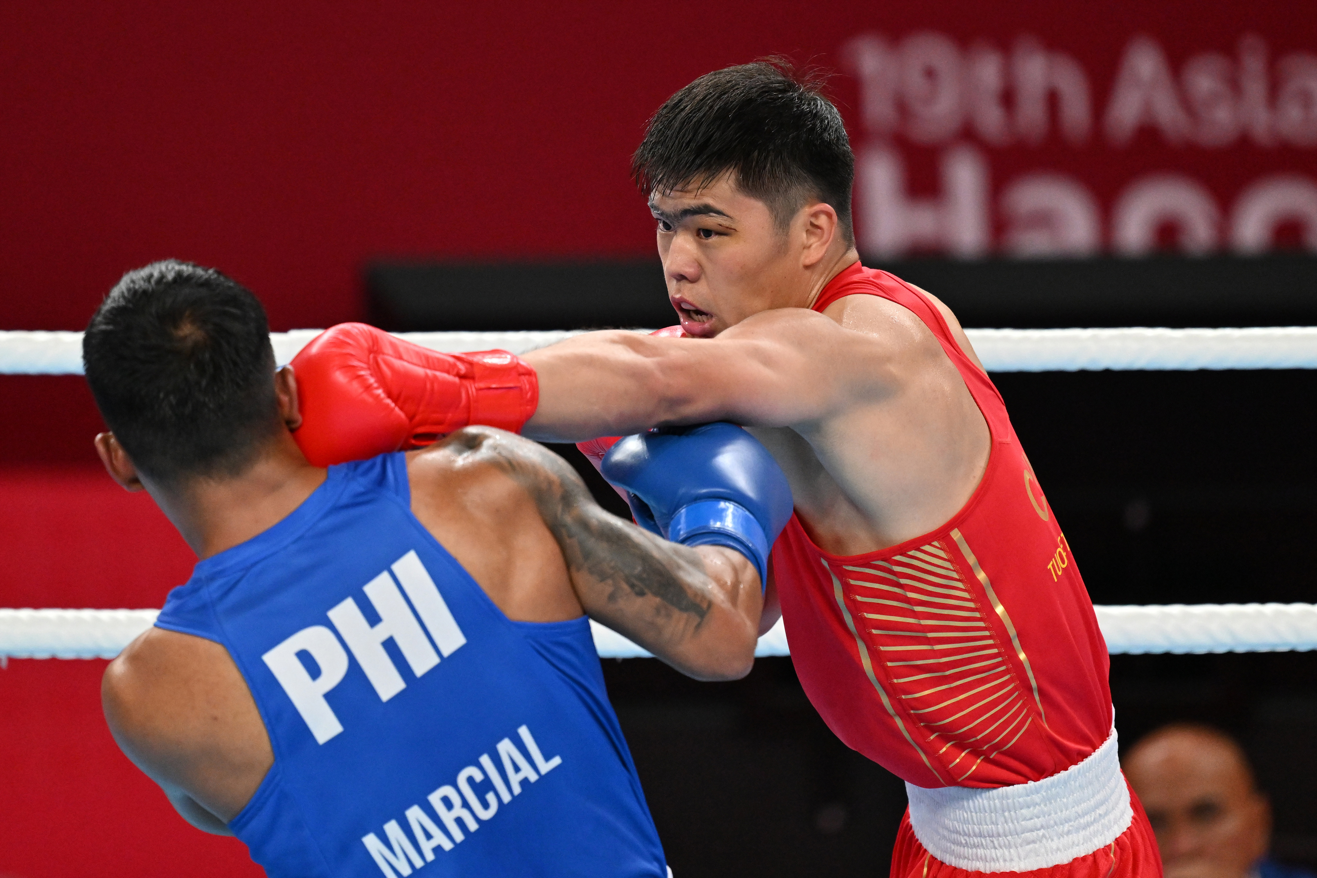 托合塔尔别克·唐拉提汗(右)在杭州亚运会决赛中。新华社记者 詹彦 摄