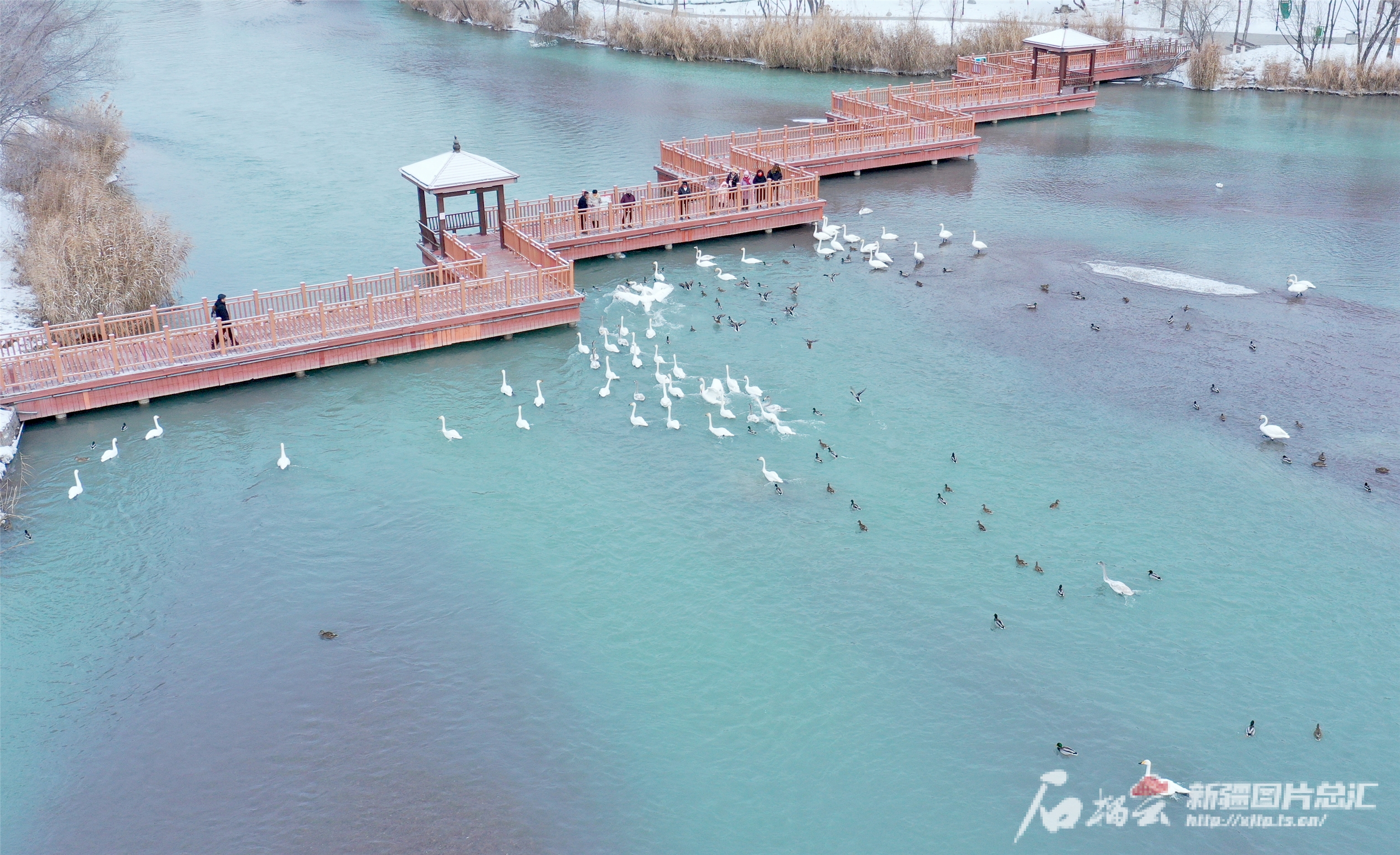 1月7日,博乐市滨河公园,天鹅在河面上自在游弋,吸引众多游客和摄影爱好者前来观赏拍照。