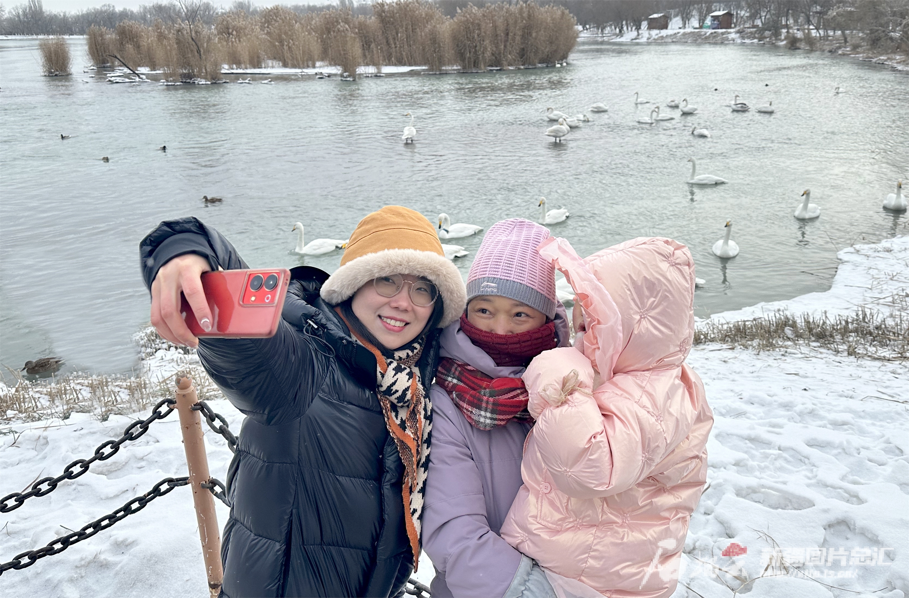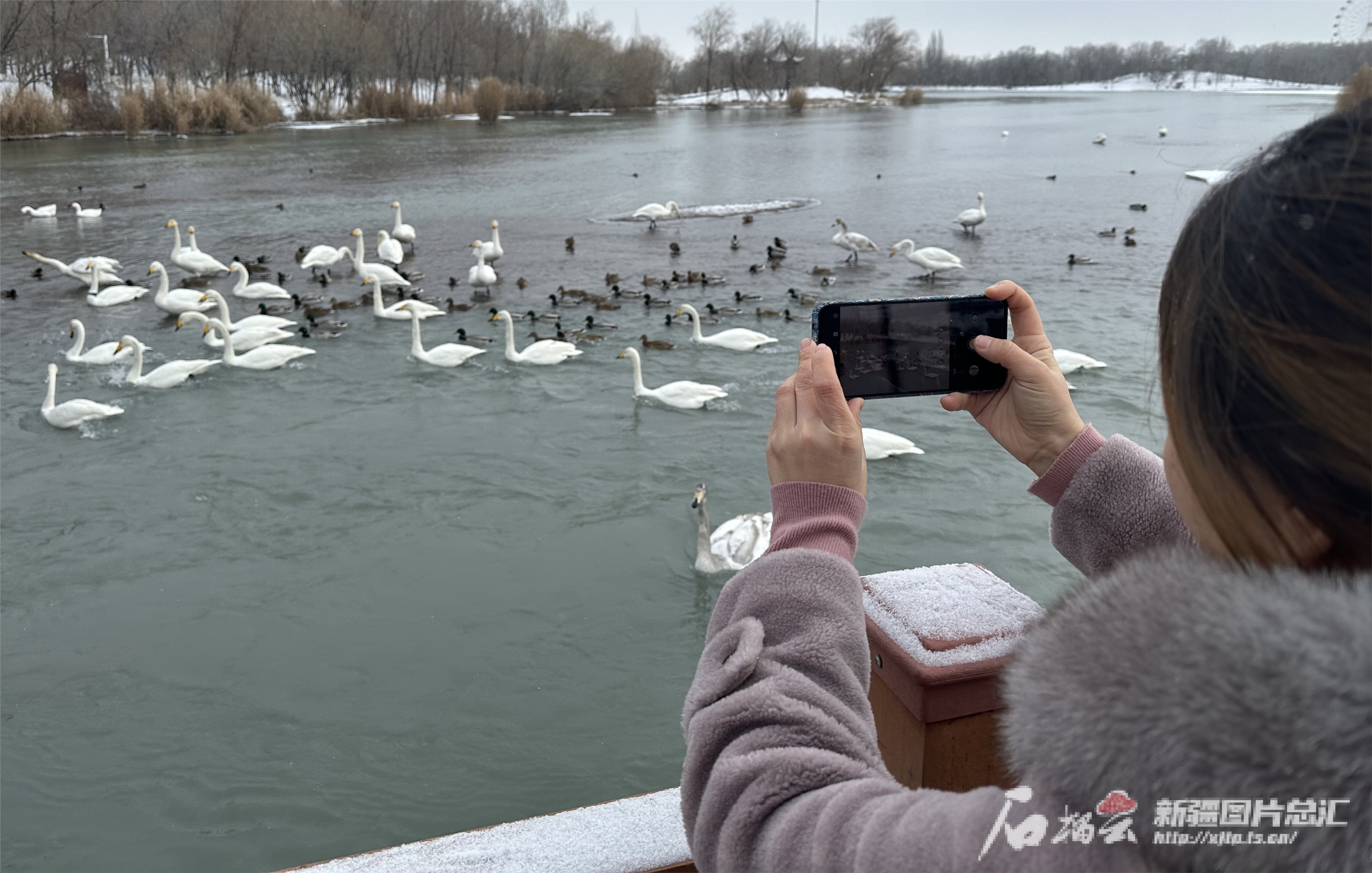1月7日,博乐市滨河公园,游客拍摄天鹅。