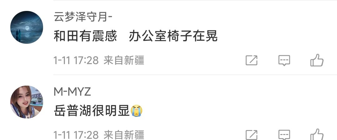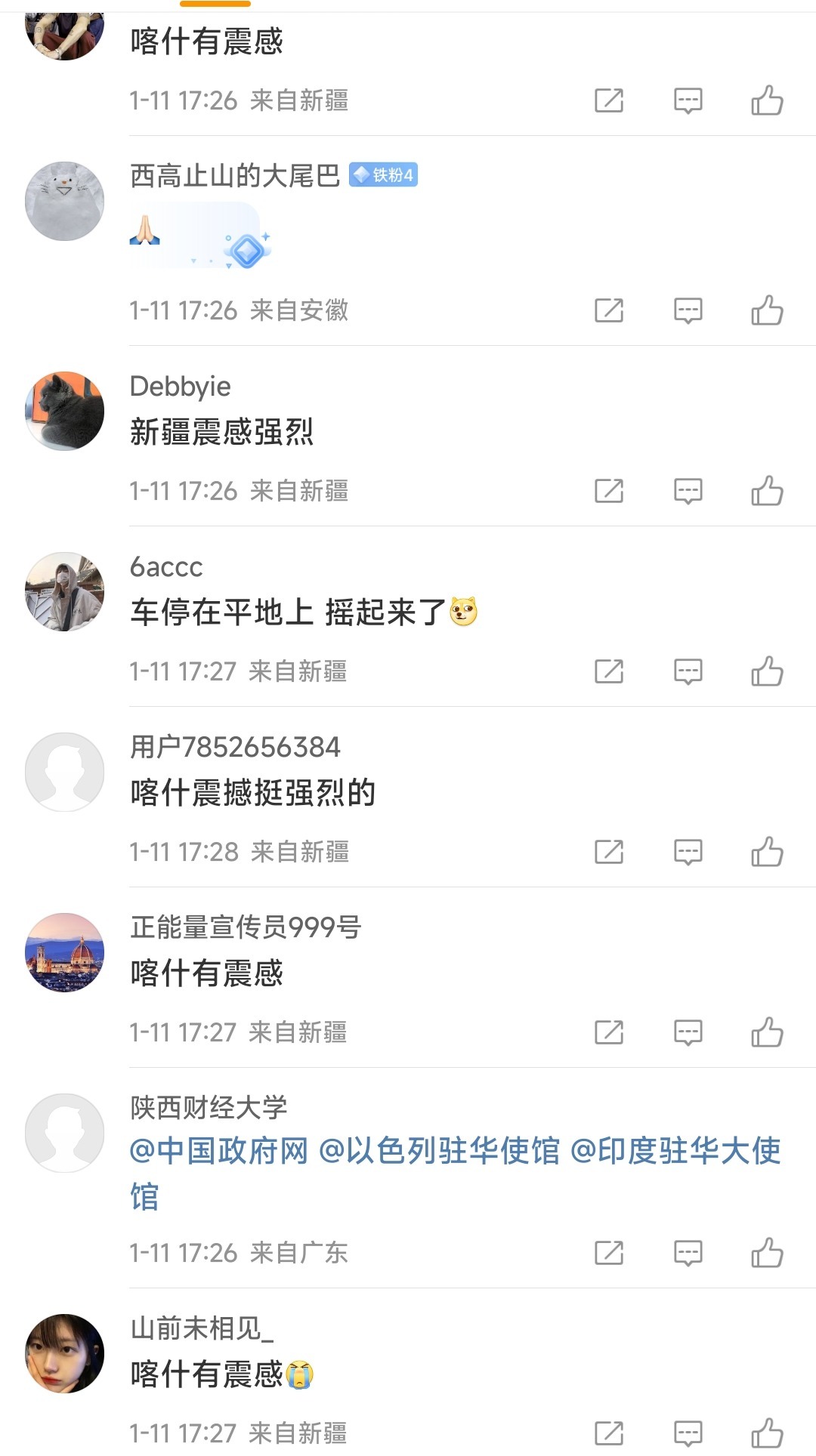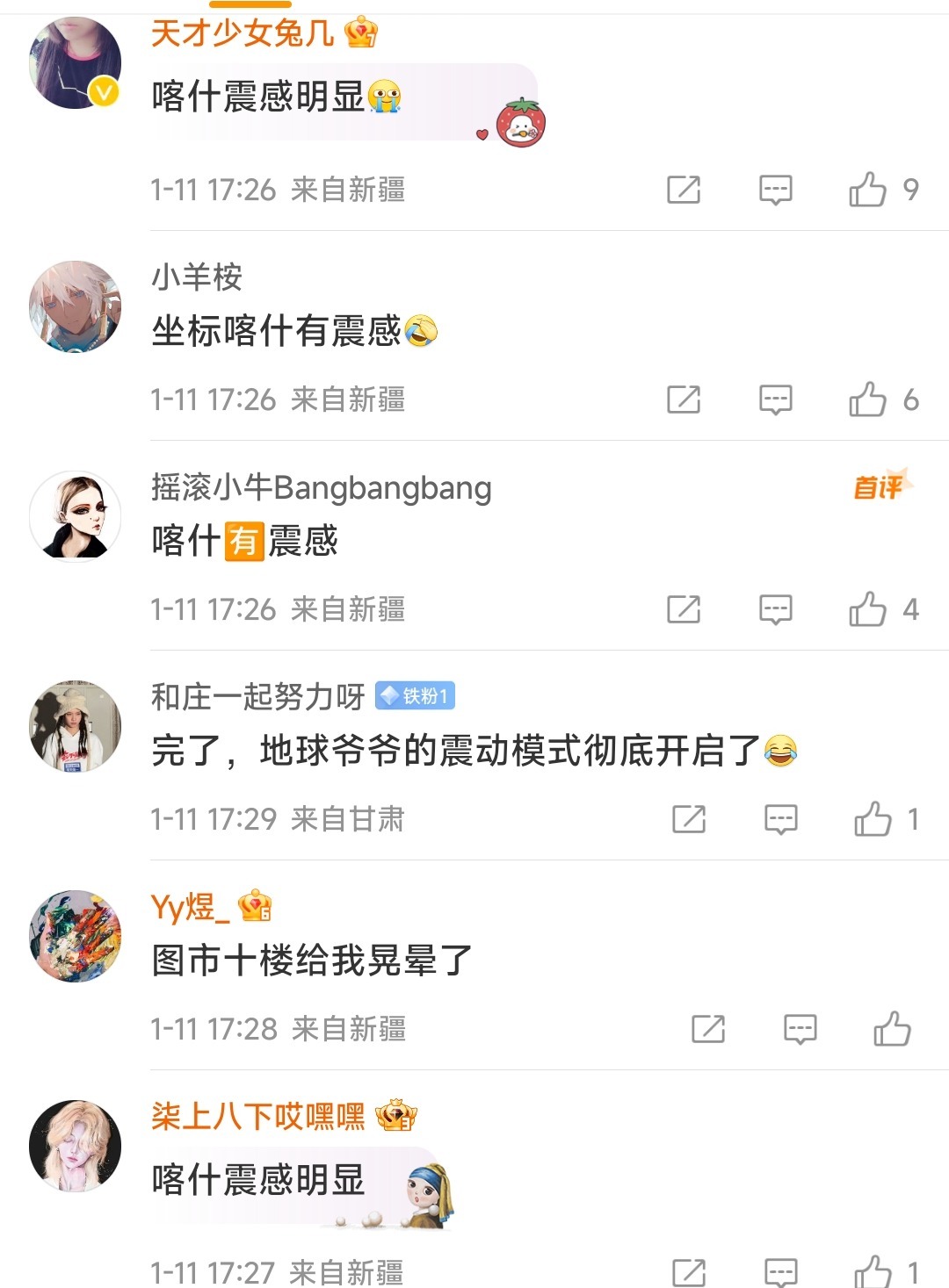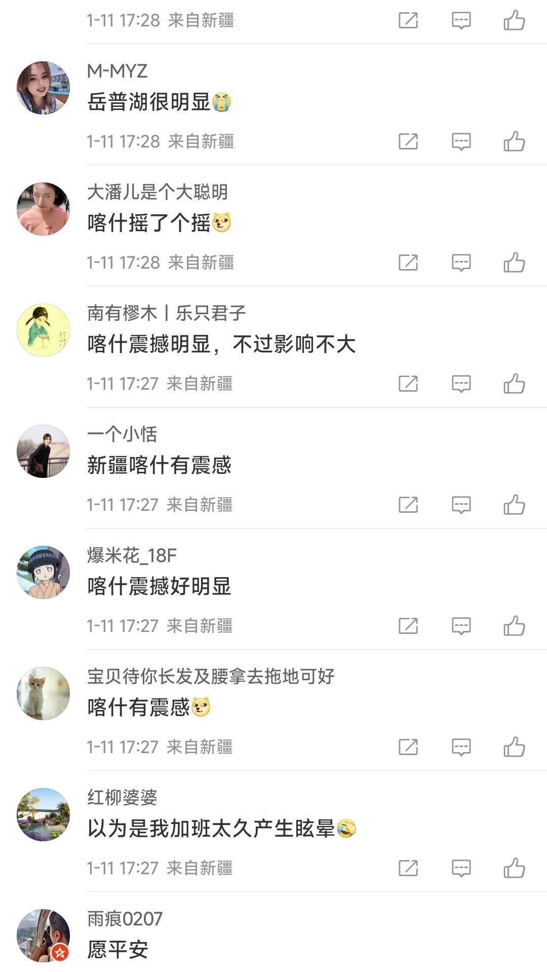 地震发生后,网友们在@中国地震台网速报的微博下留言,表示中国新疆喀什震感强烈,但好在没什么事。