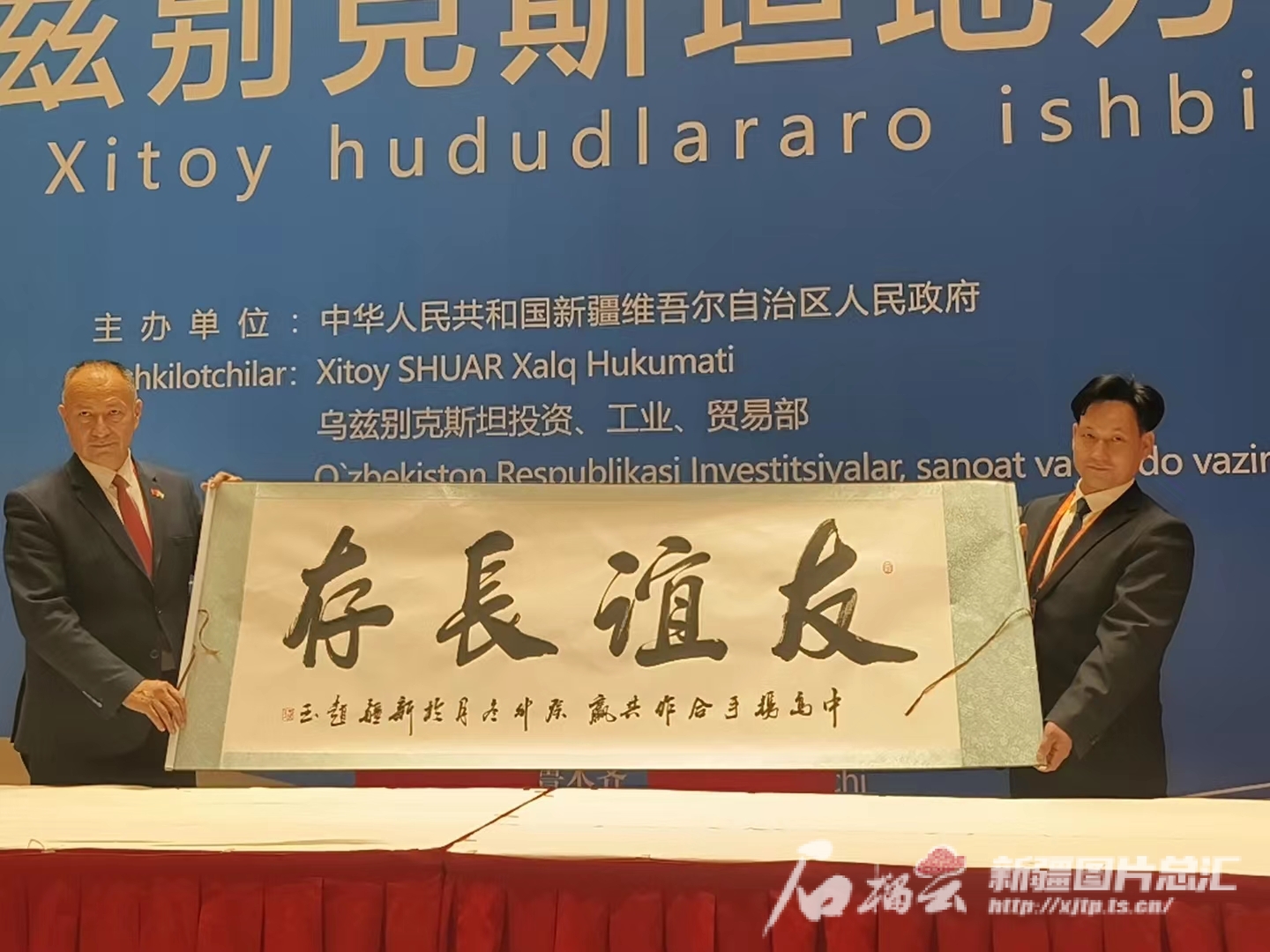 1月22日,中国—乌兹别克斯坦地方间企业对接会召开,书法爱好者给乌方赠字。天山网-新疆日报记者 黑宏伟摄